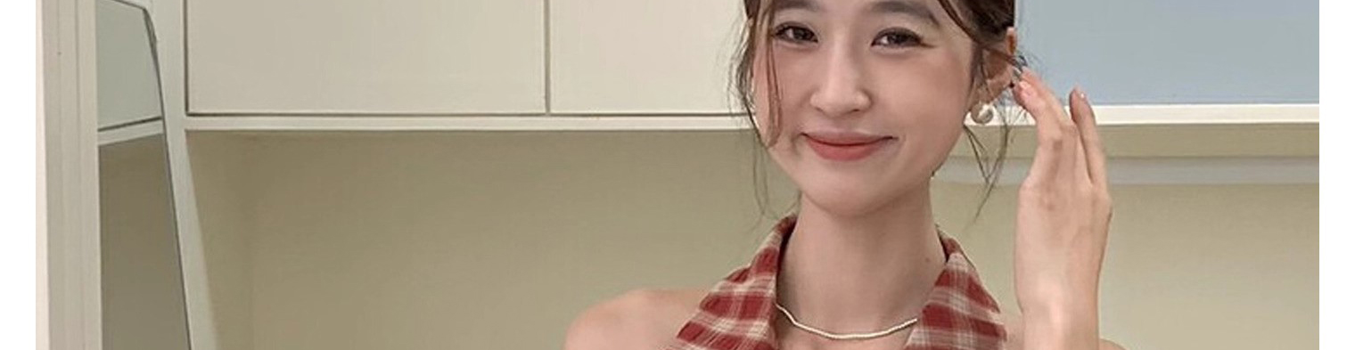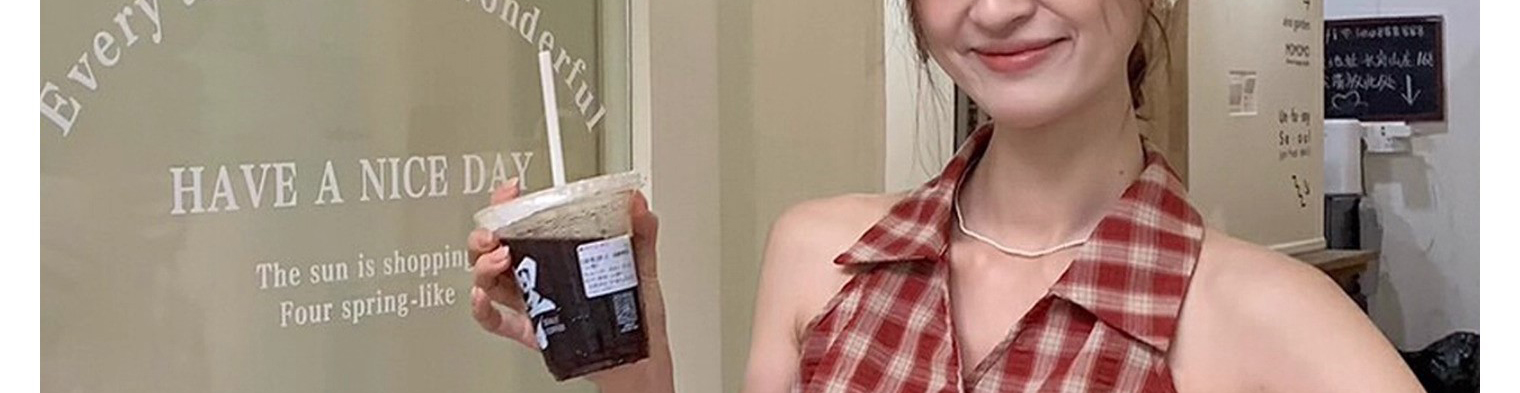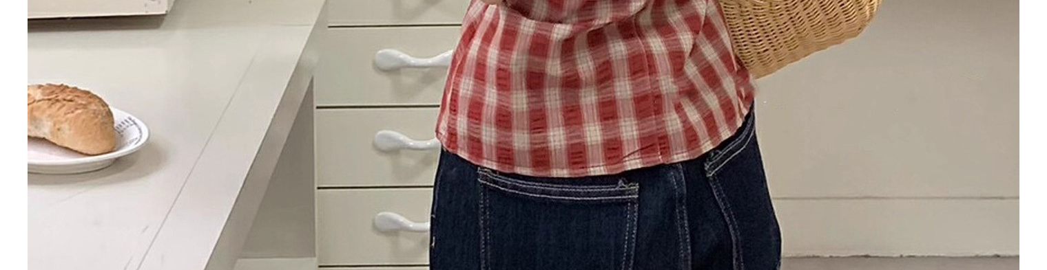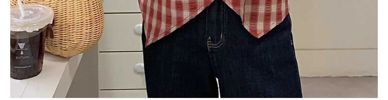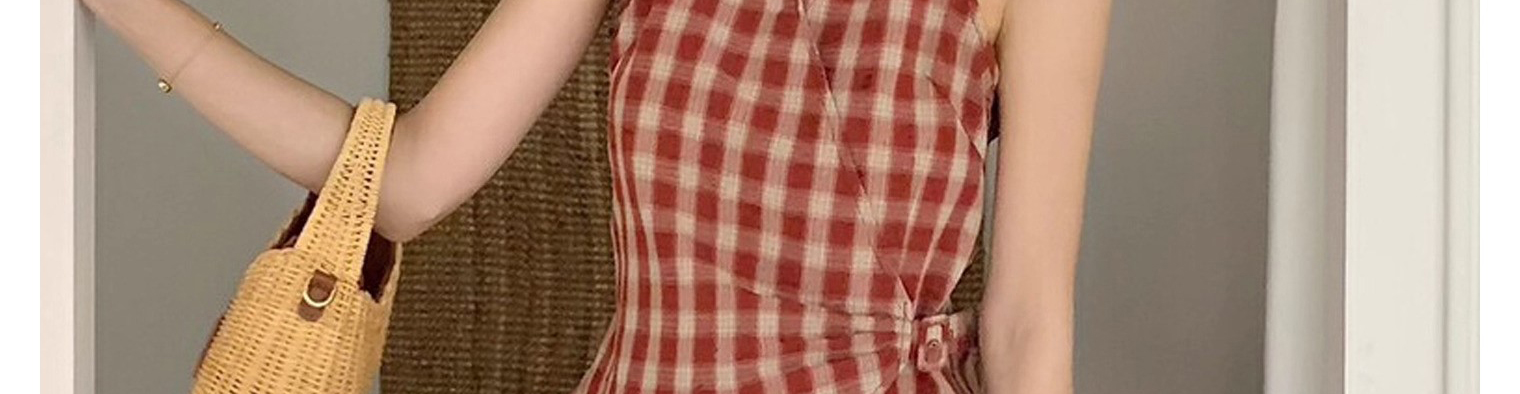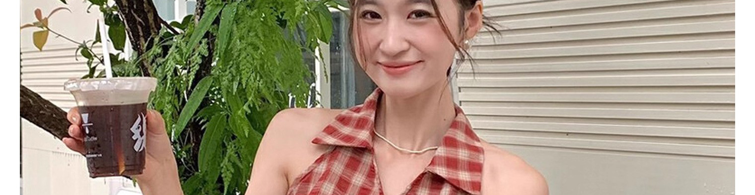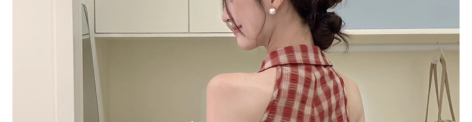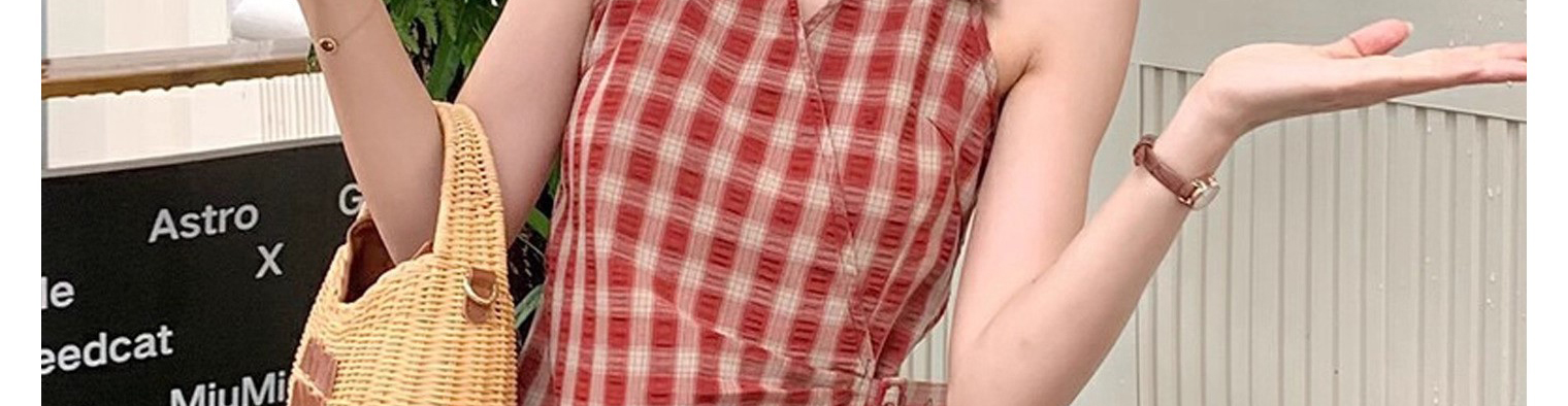 - Top: V-neck red check vest shirt, slim fit, irregular hem, chic French summer style.