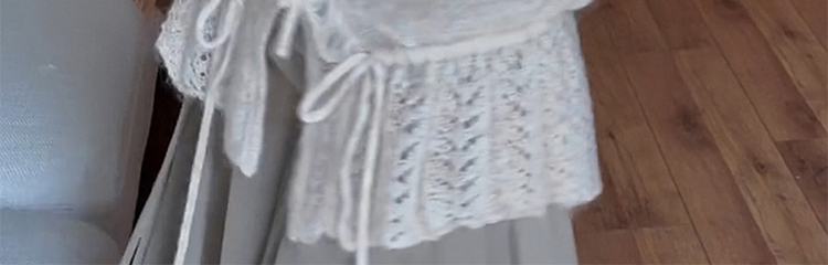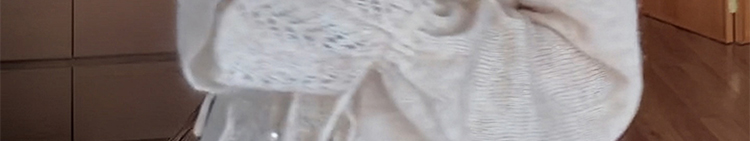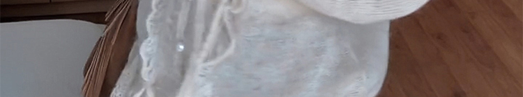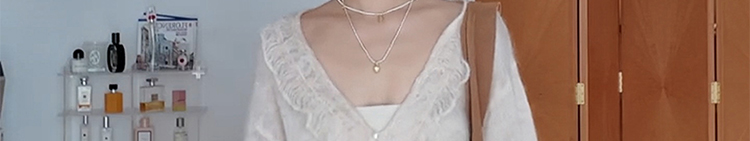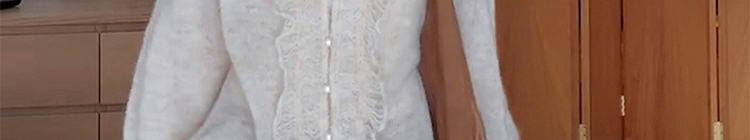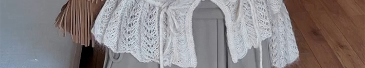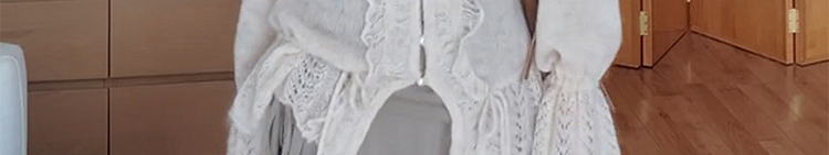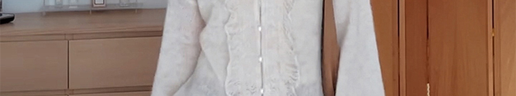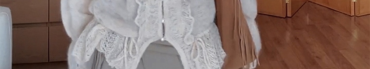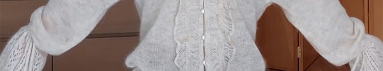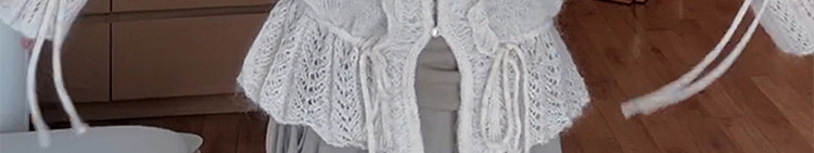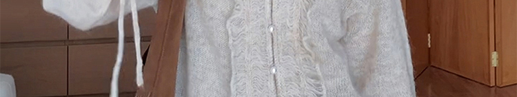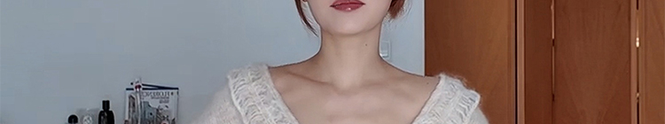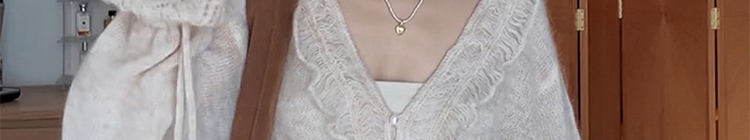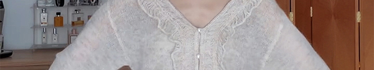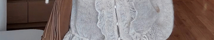 - Top: Soft mohair knit sweater with V-neck and ruffled edges, loose and flattering fit.