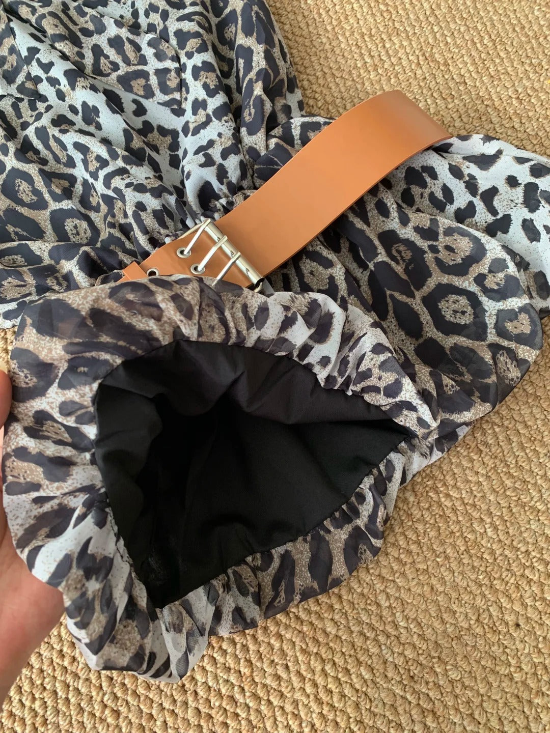 - Dress: Gray leopard tank-style mini dress with a sleek bodycon silhouette and edgy Y2K feel.