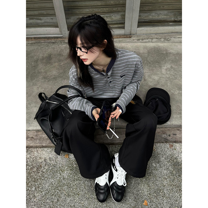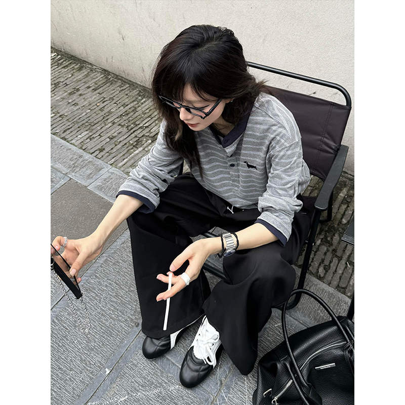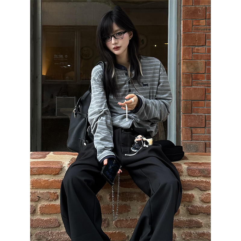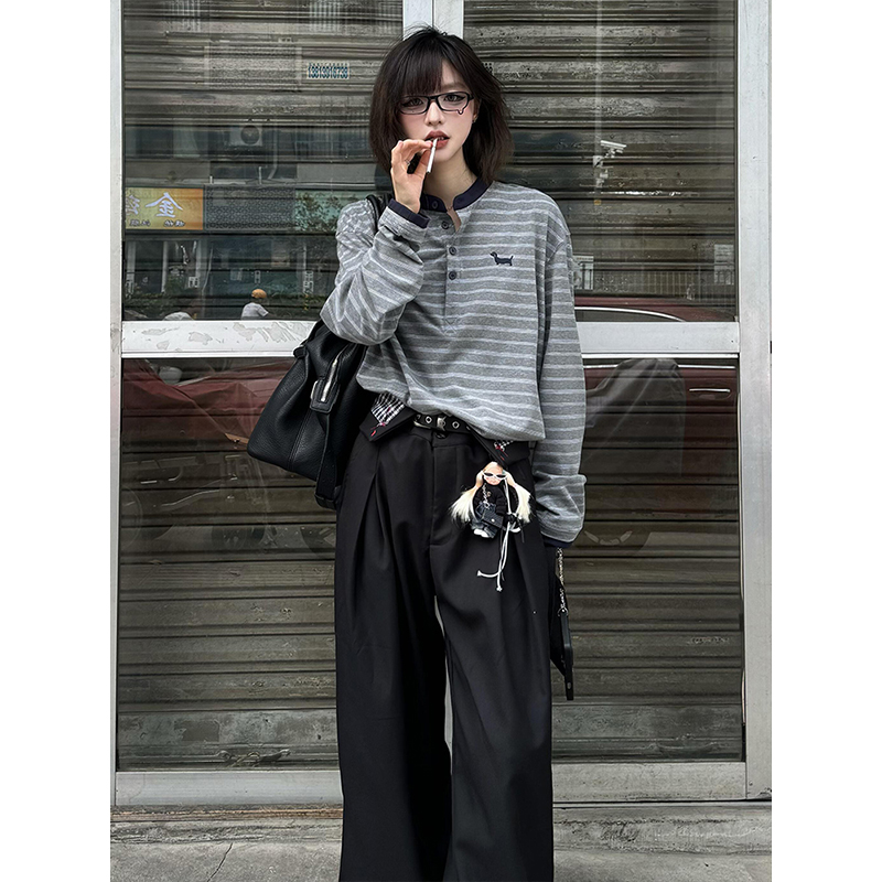 Gray striped Henley long sleeve tee with dog embroidery. Loose fit, casual and comfy for early autumn wear.