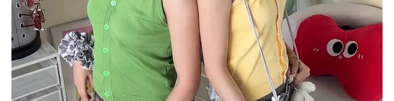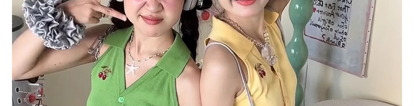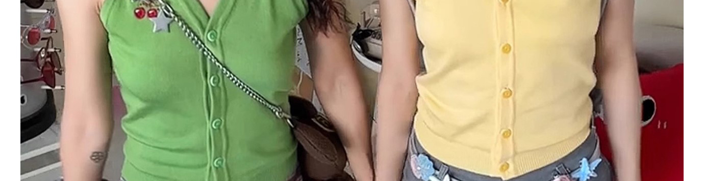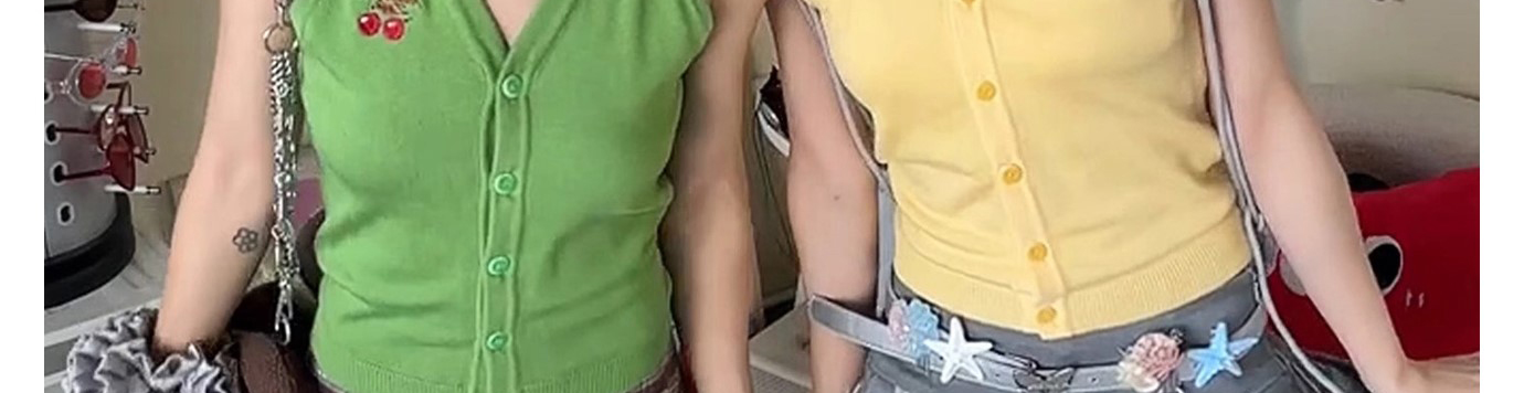 - Top: Sleeveless knit vest with cherry embroidery and polo collar, short and slim-fit design for summer.