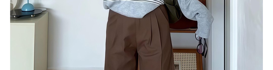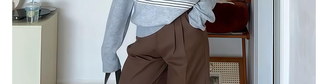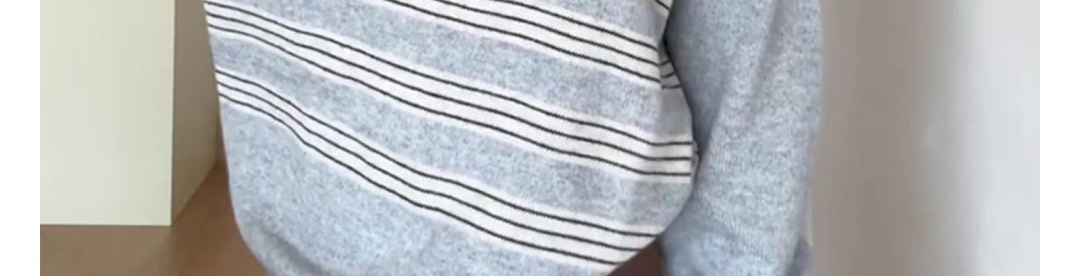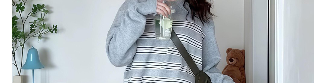Polo collar knit sweater with stripe jacquard pattern. Loose fit, casual and versatile for autumn wear.