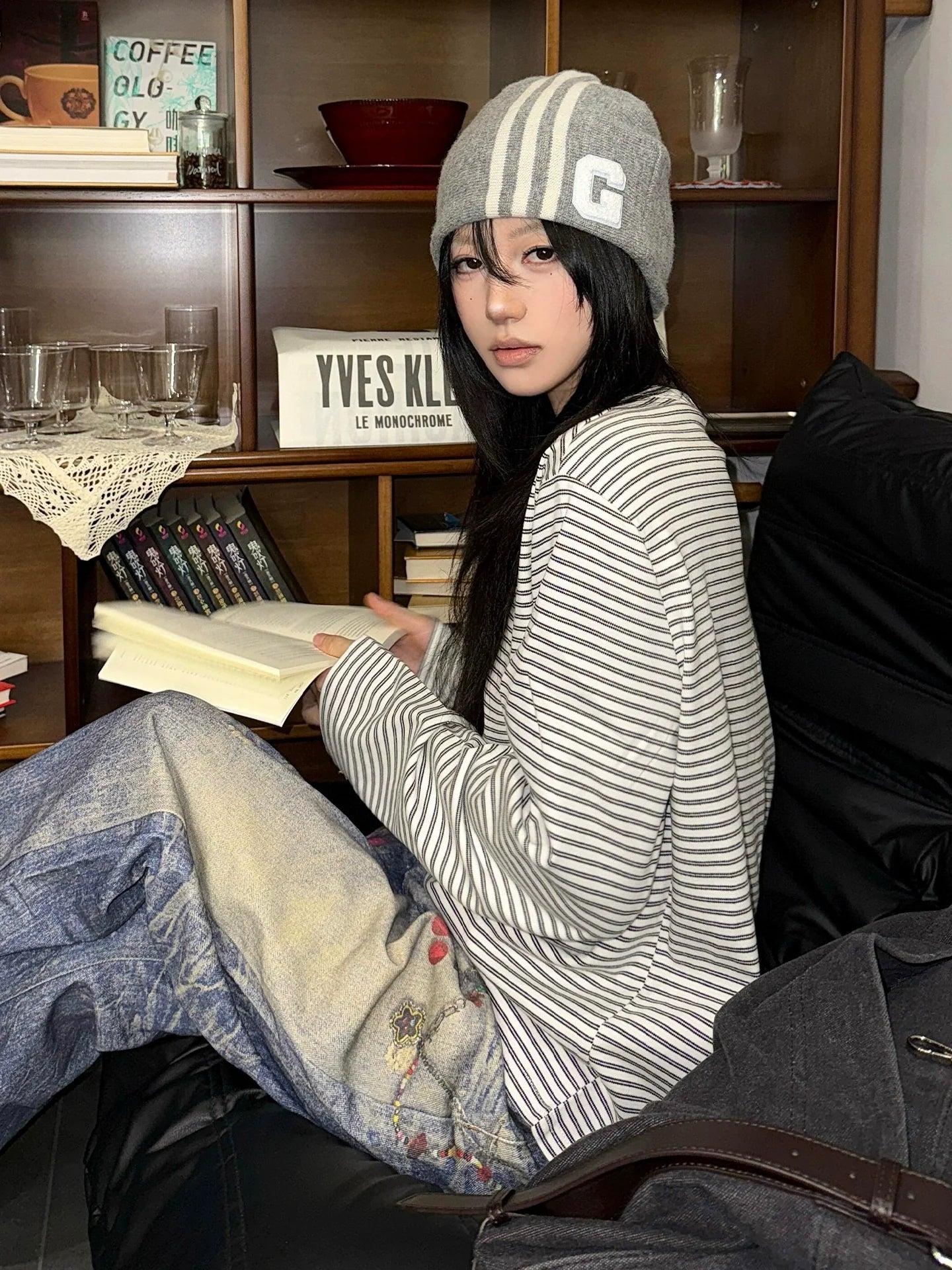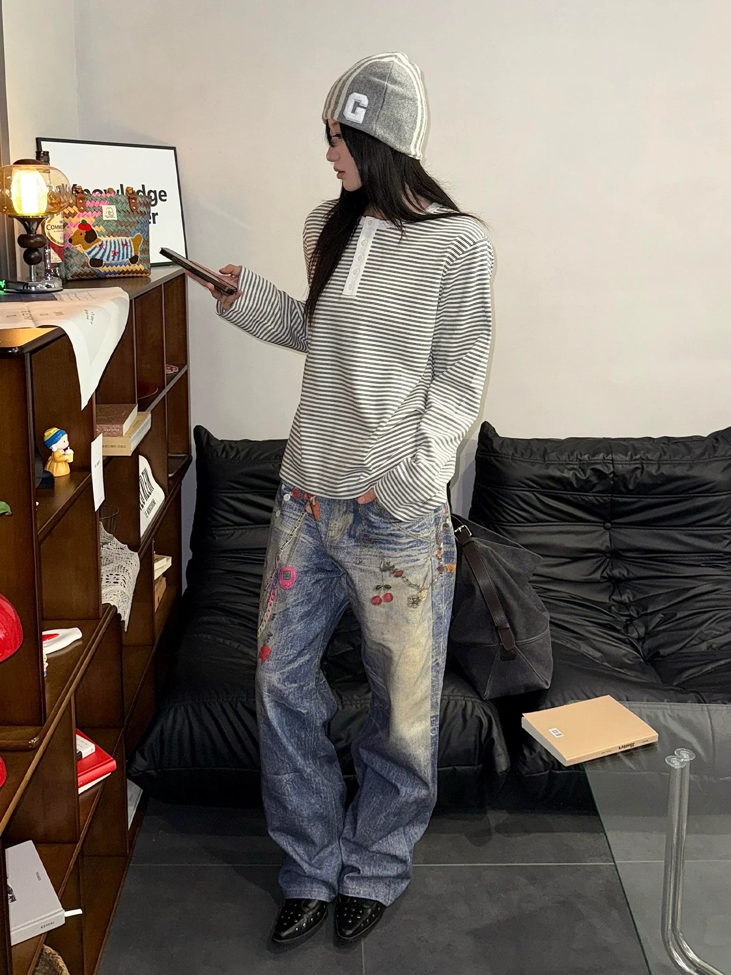 - Top: Classic Henley long sleeve t-shirt with stripes, slim fit cleancut design, soft cotton fabric perfect for autumn layering.
