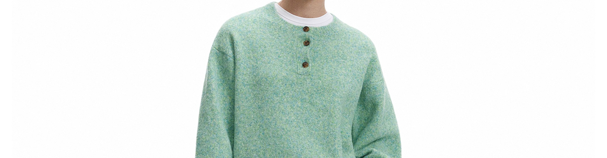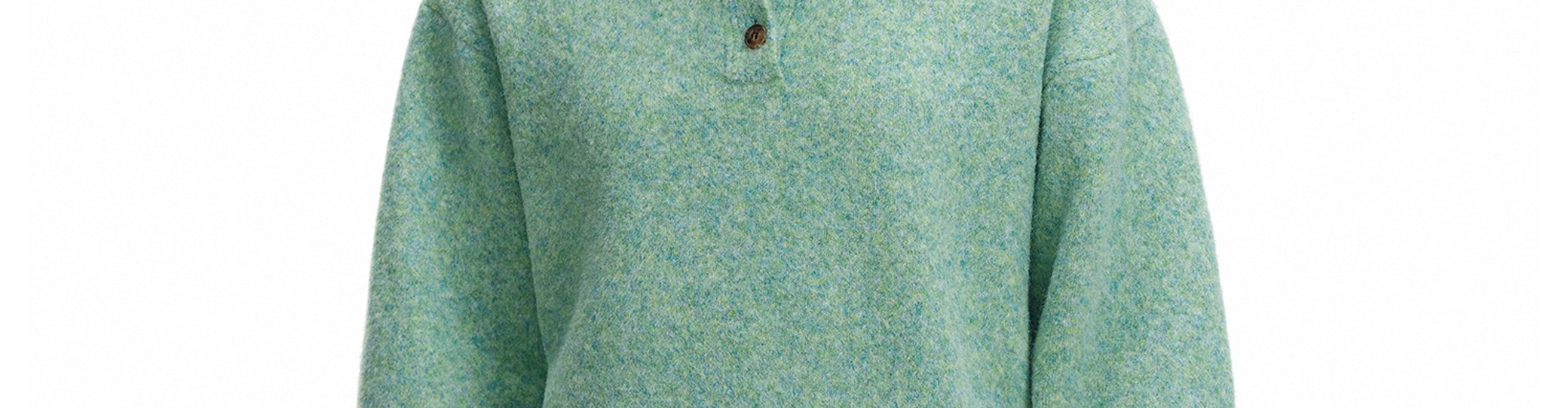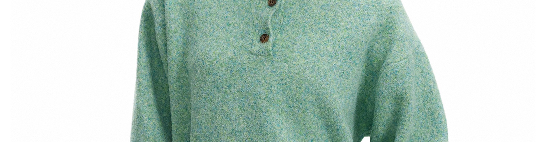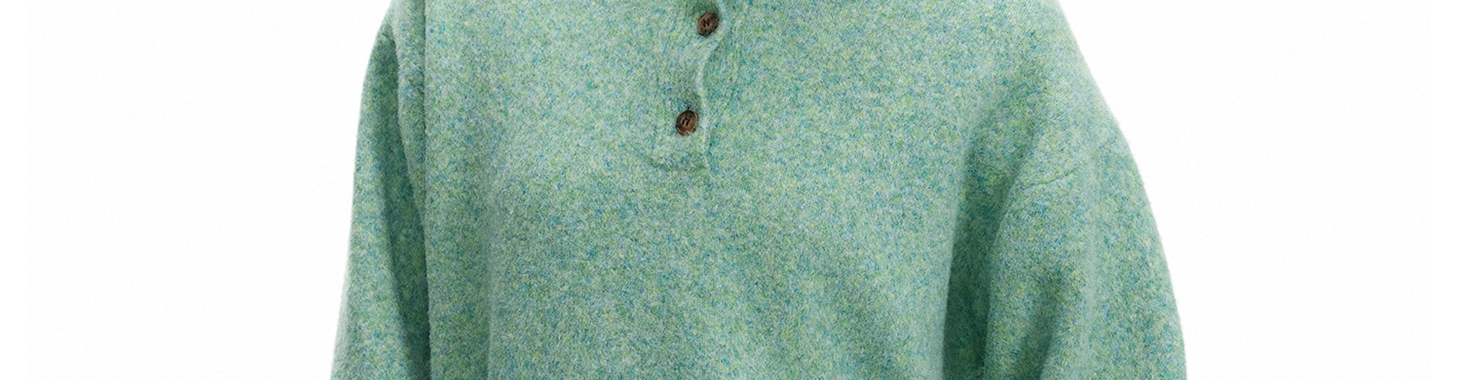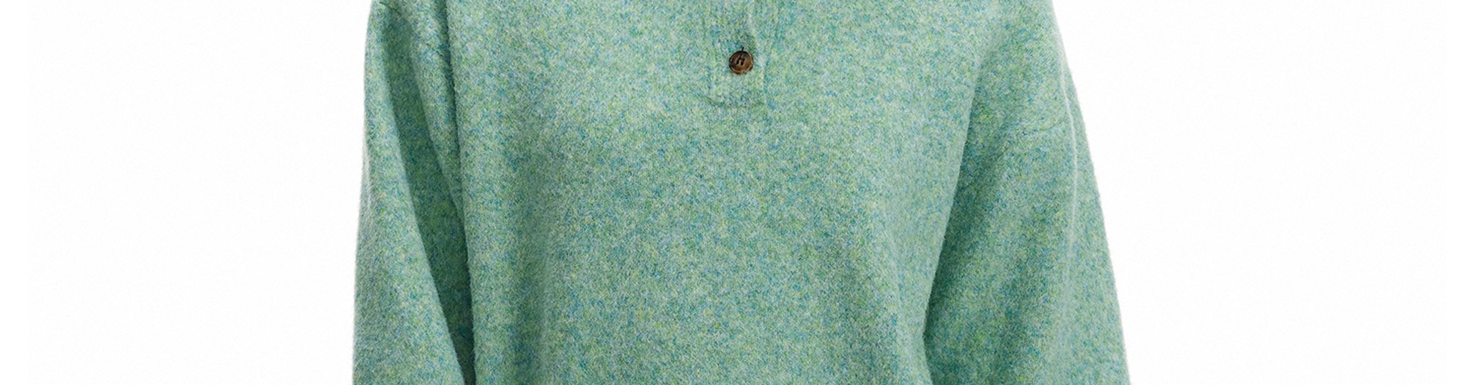 Retro green Henry collar knit sweater. Loose fit, cozy and casual for autumn wear.