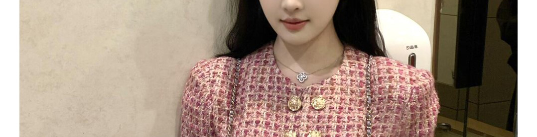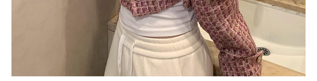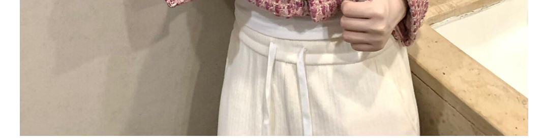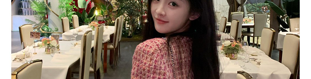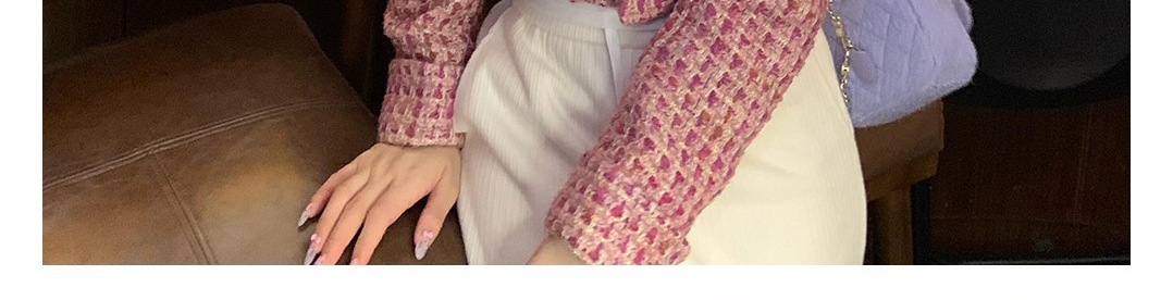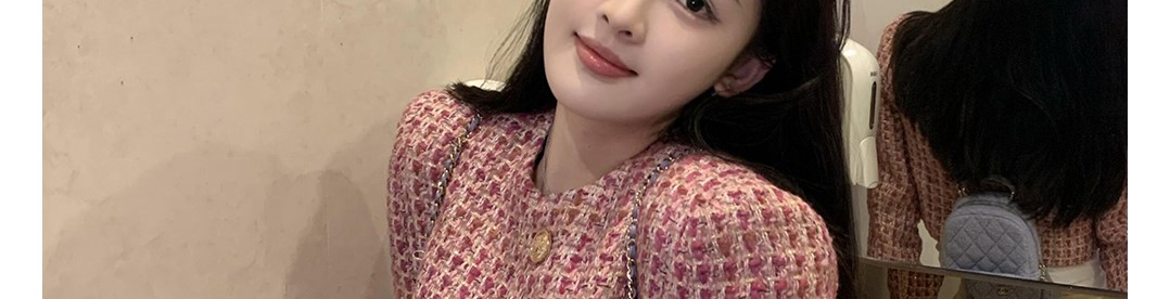 - Top: Cropped pink jacket with premium tweed-inspired fabric, structured autumn fit, elegant and chic design.