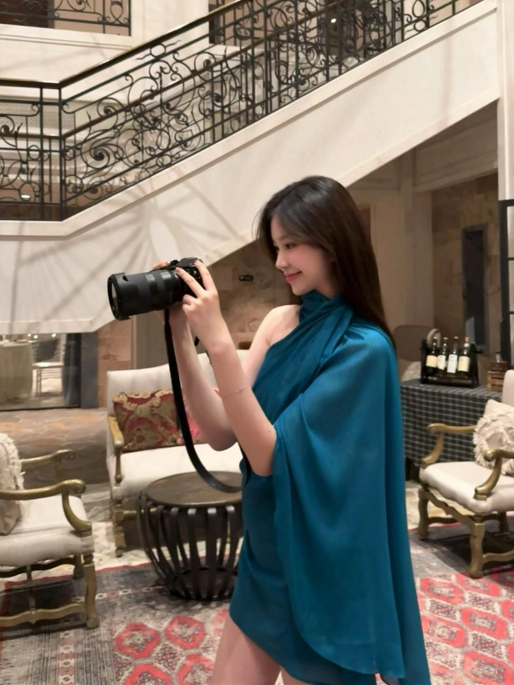 - Dress: Mini dress with halter straps, off-the-shoulder sleeves, and iridescent blue fabric for a fun, eye-catching style.