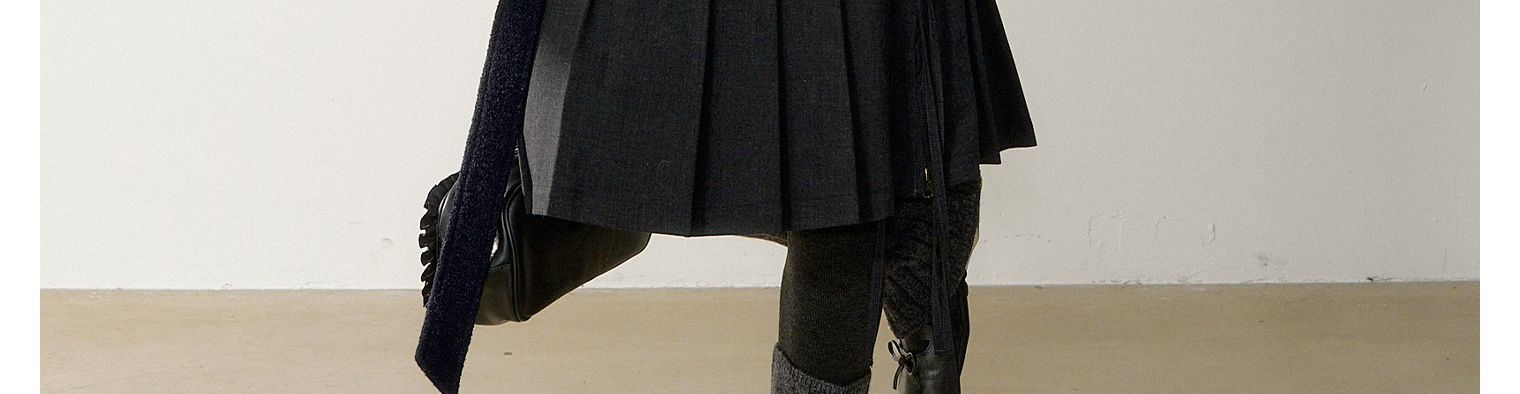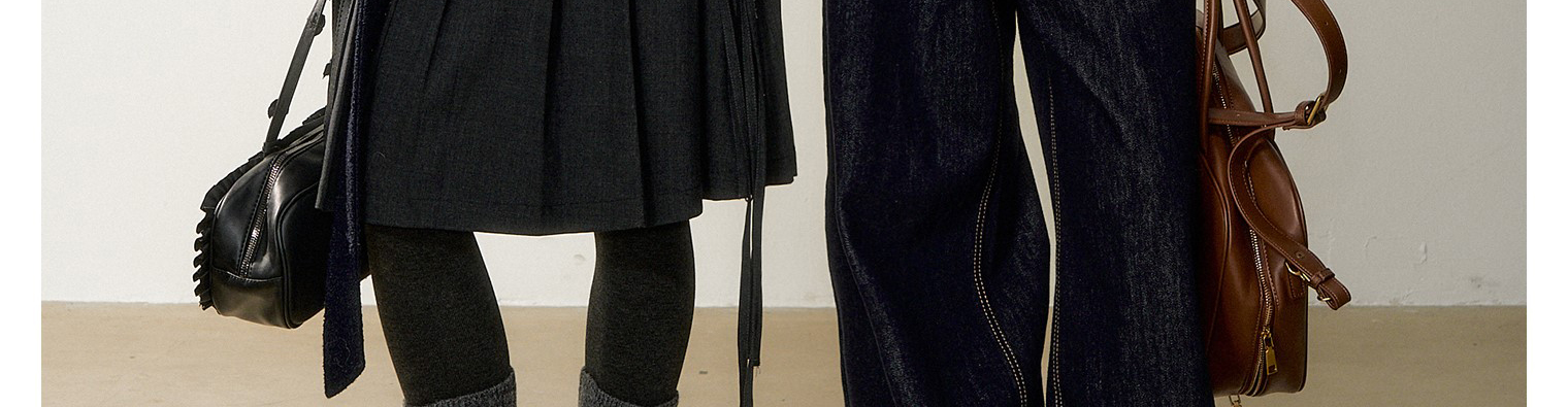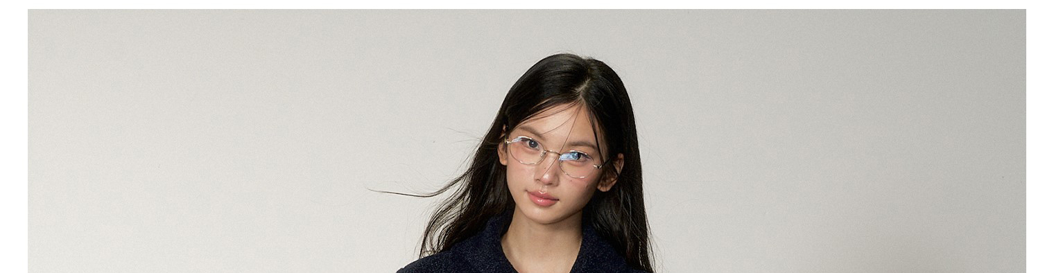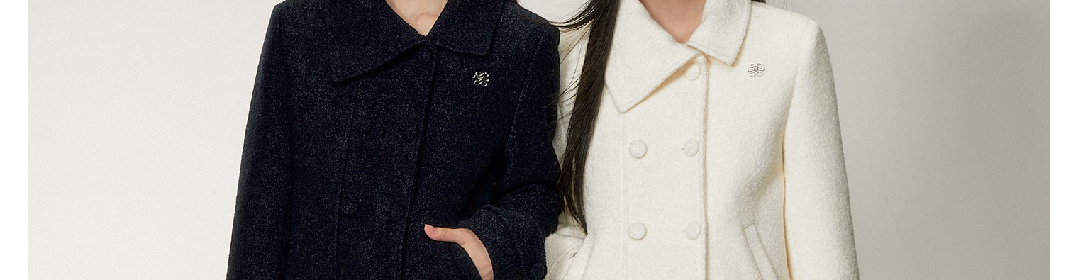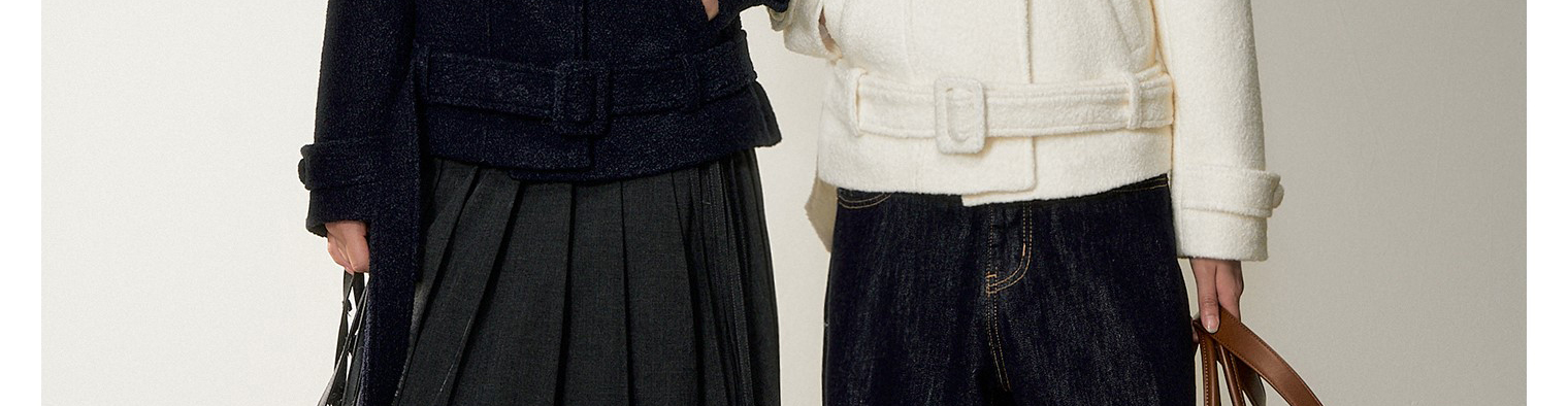 - Top: Elegant wool-blend coat with asymmetrical double-breasted design, navy blue color, structured fit.