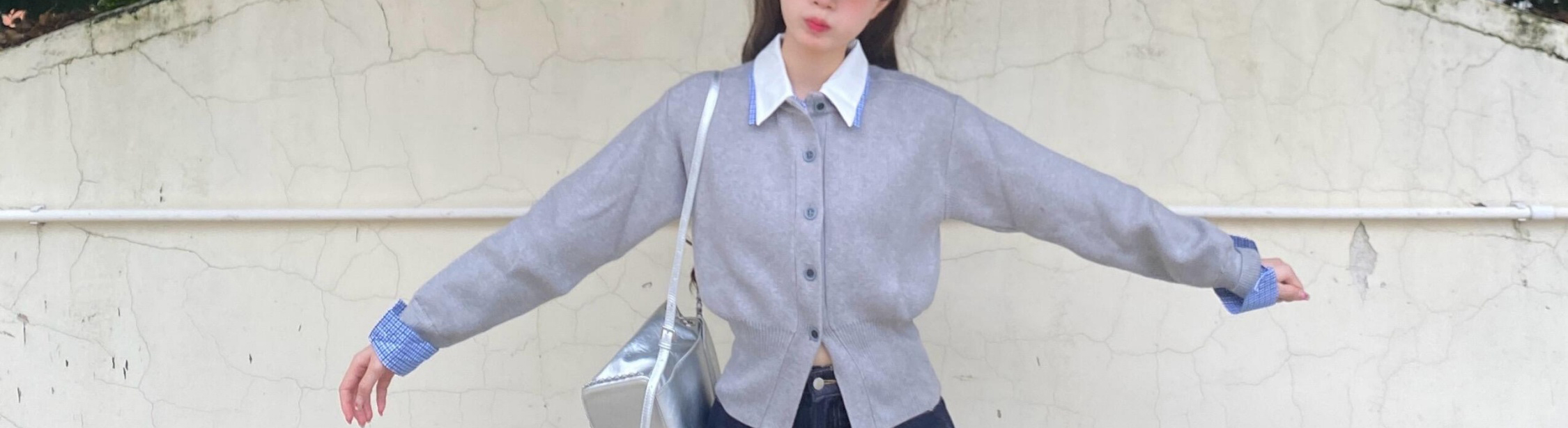- Cardigan: Short knit cardigan with shirt collar layered design and color-block details, soft autumn fabric.