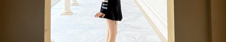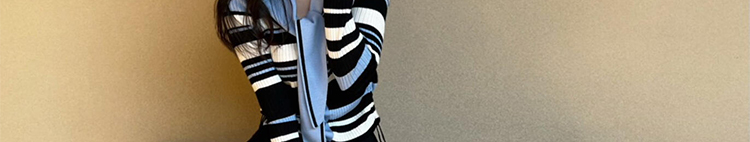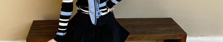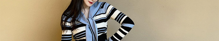 - Top: Slim-fit striped knit sweater with navy collar and colorblock design, soft autumn fabric.