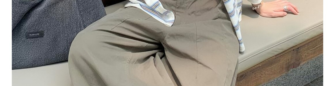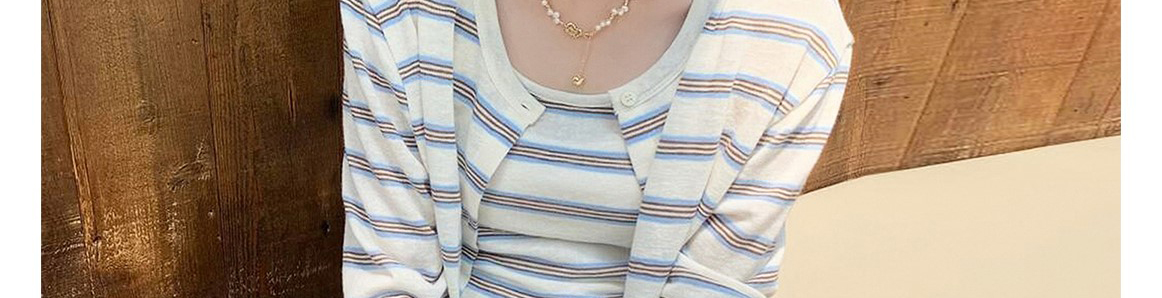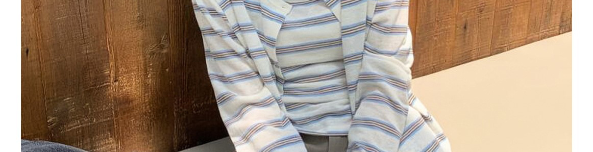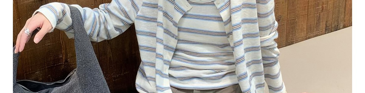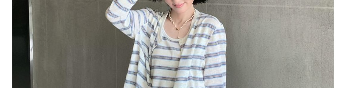 - Top: Two-piece set with striped knit cardigan and matching tank top, loose and comfy for early autumn.