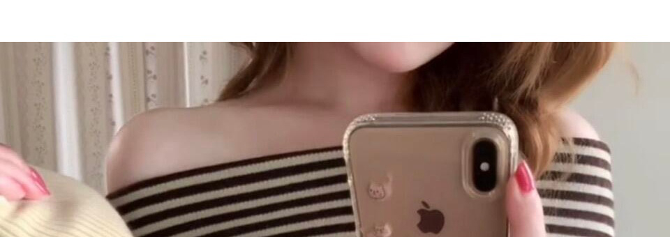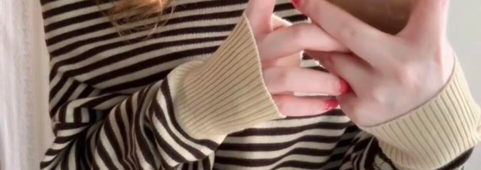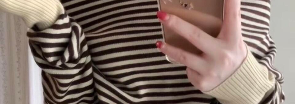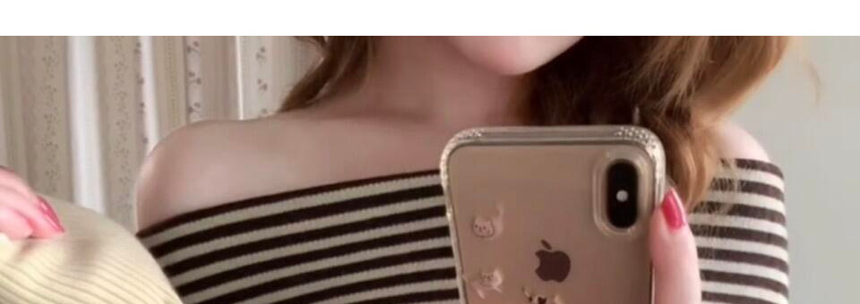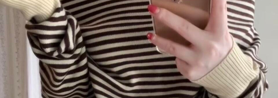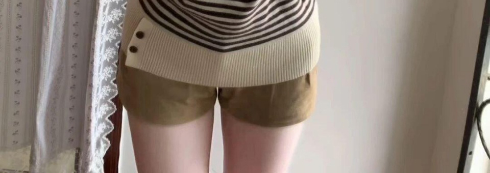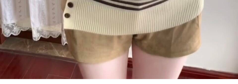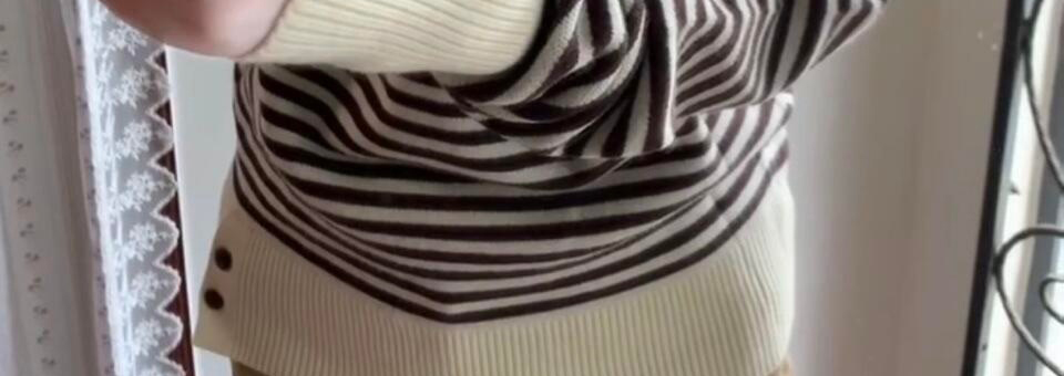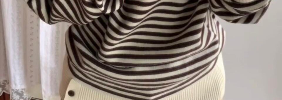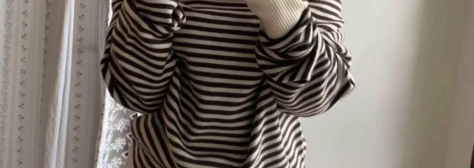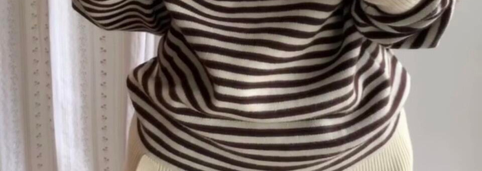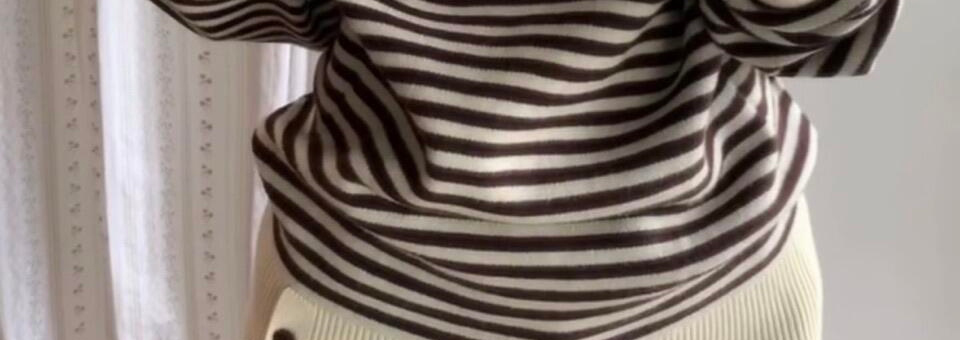 - Top: Loose-fit striped knit sweater with off-shoulder neckline, soft early autumn fabric.