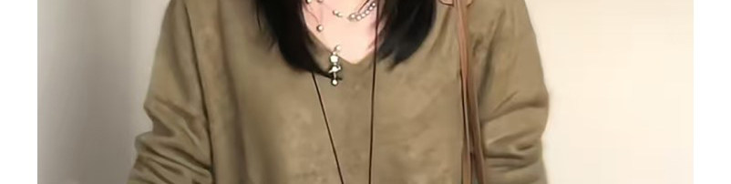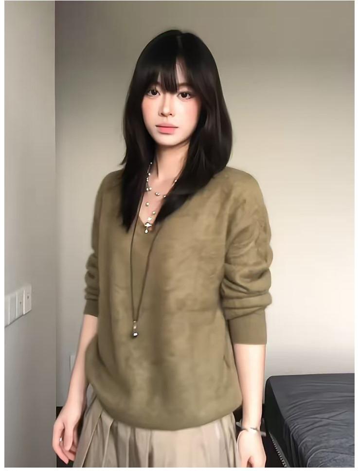 - Top: Loose-fit V-neck pullover knit sweater, soft autumn fabric, retro Korean style.