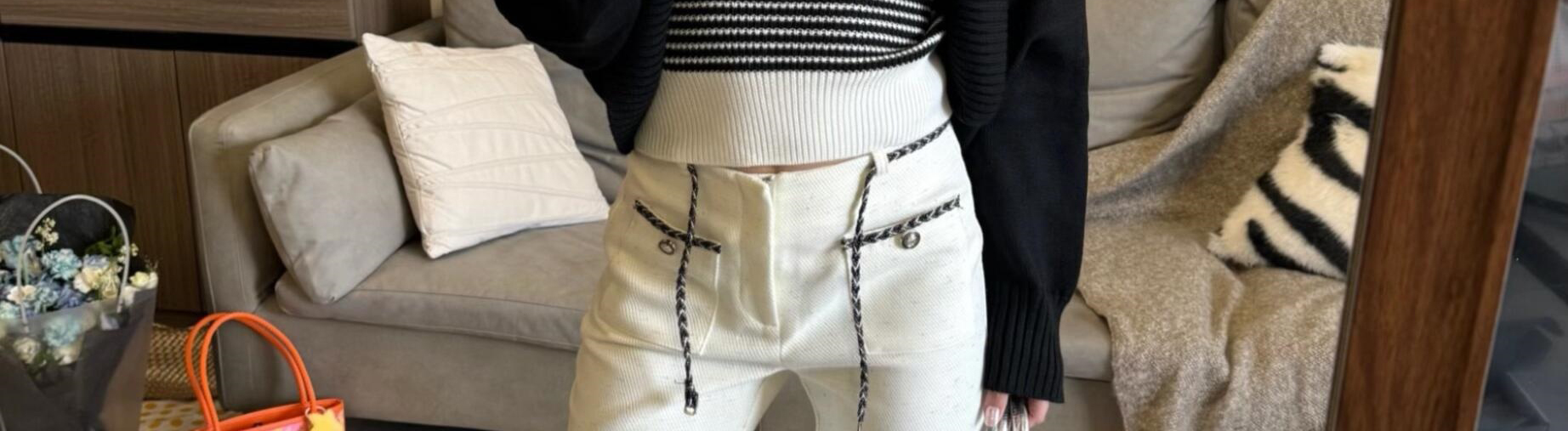 - Top: Two-piece set with relaxed-fit black cardigan featuring contrast stripes and matching bustier-style knit top.