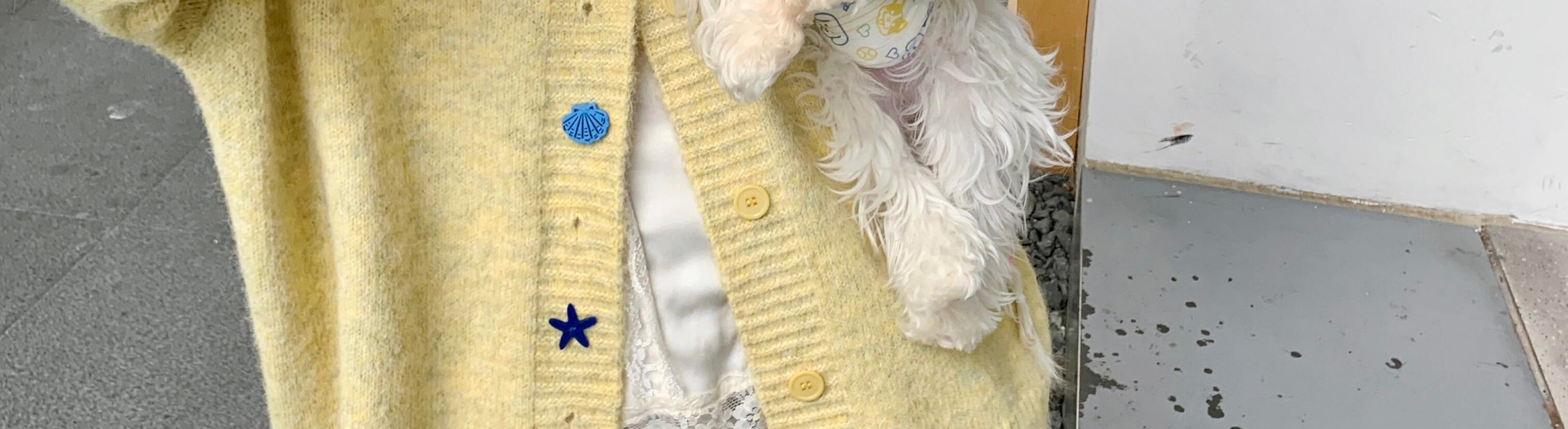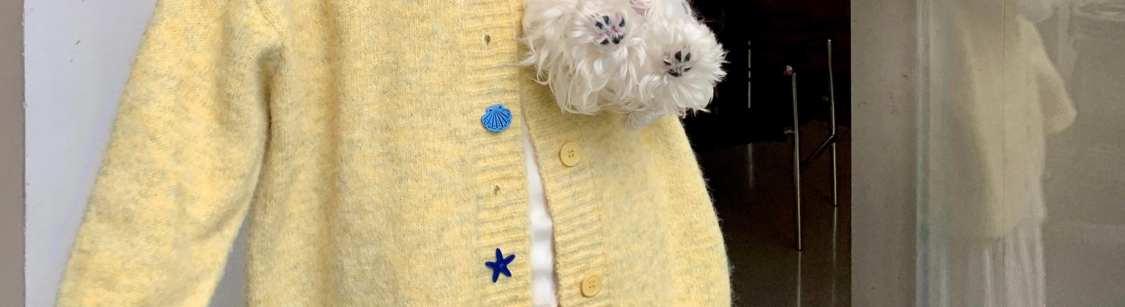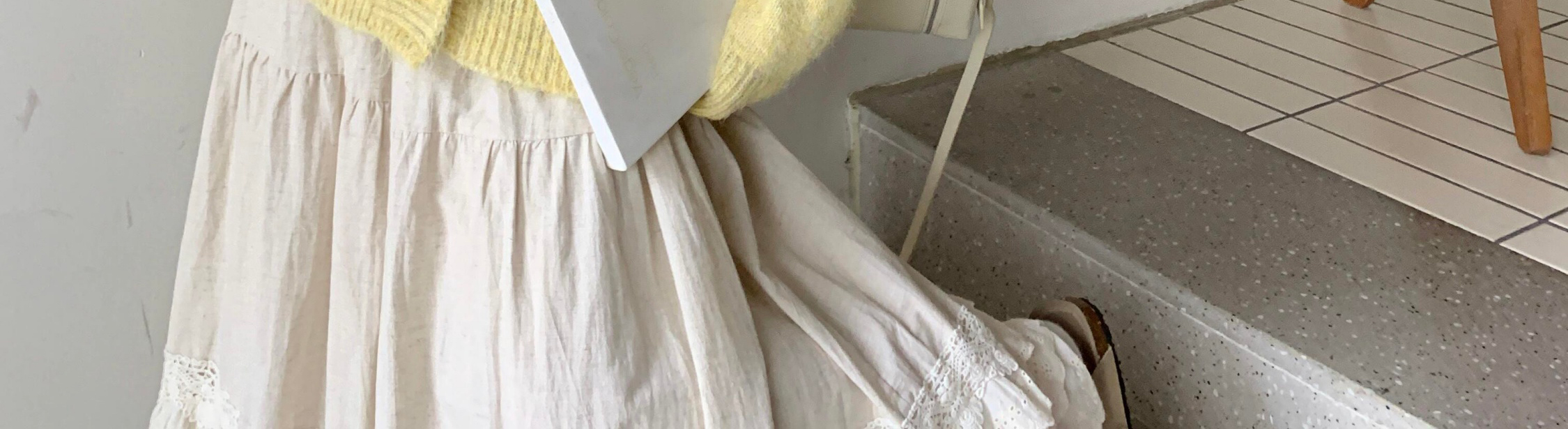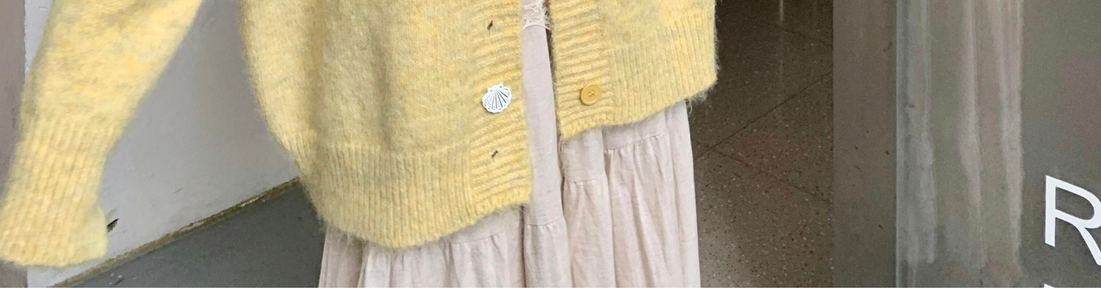 - Cardigan: Mid-length hooded knit cardigan in soft cream yellow, loose fit, cozy autumn fabric.
