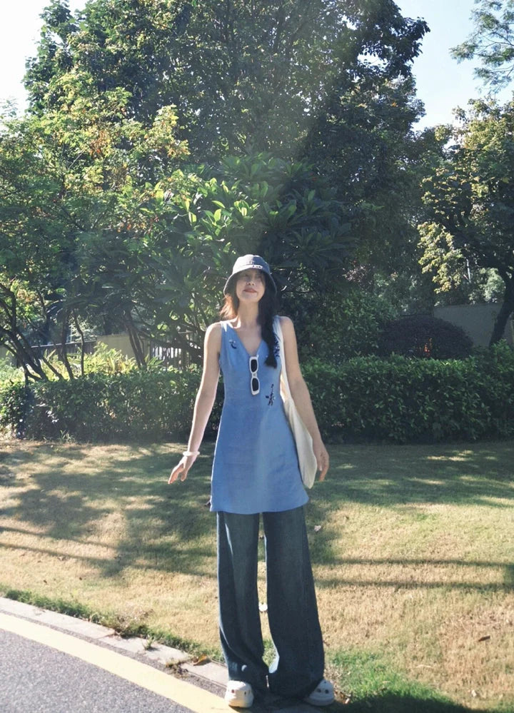 - Dress: Retro-inspired tank mini dress with V-neck, linen fabric, and subtle beading details. Lightweight and breathable for casual summer wear.