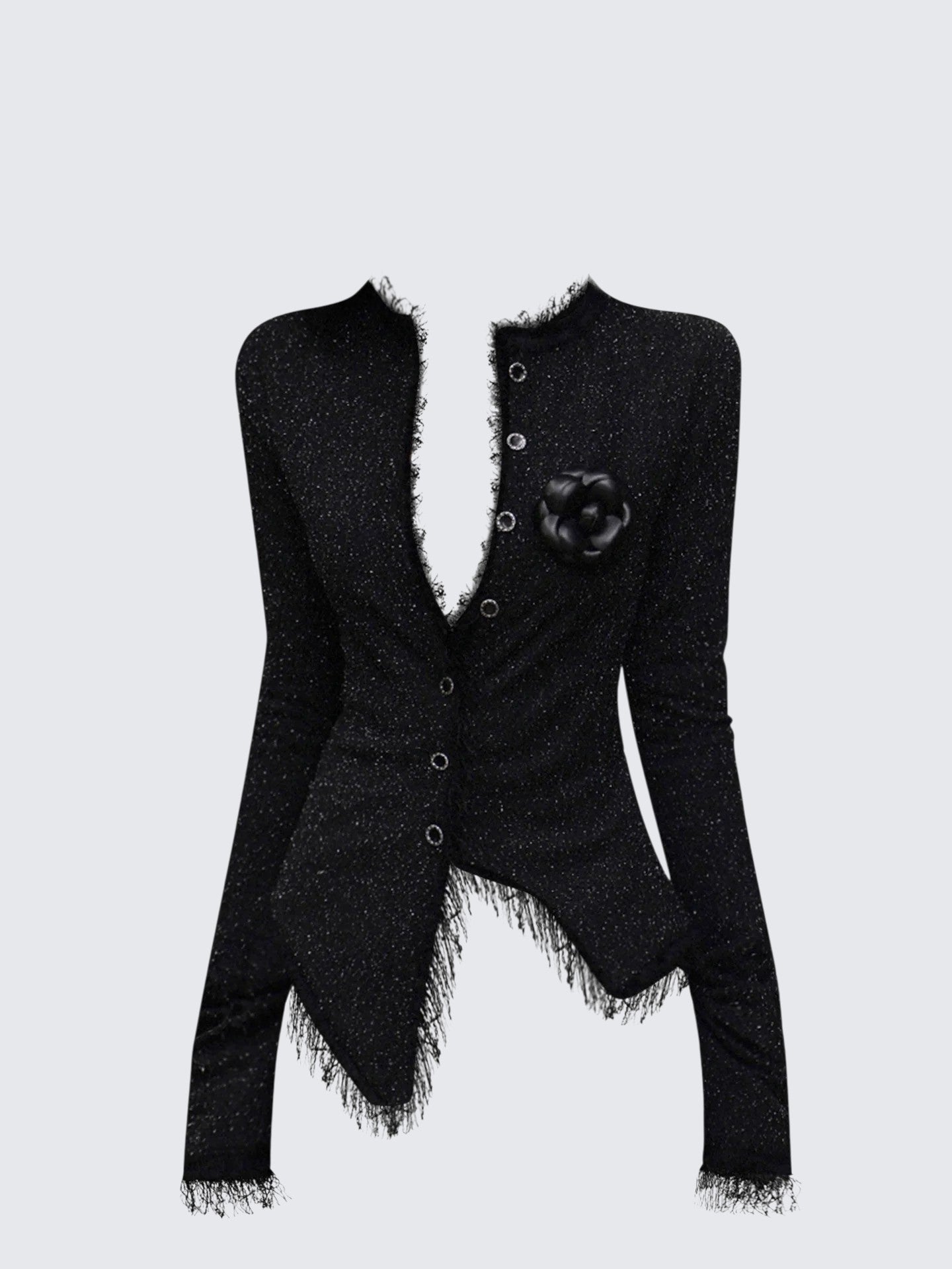 - Cardigan: Irregular black knit cardigan with fitted waist, shimmering yarn, and Chanel-inspired design.