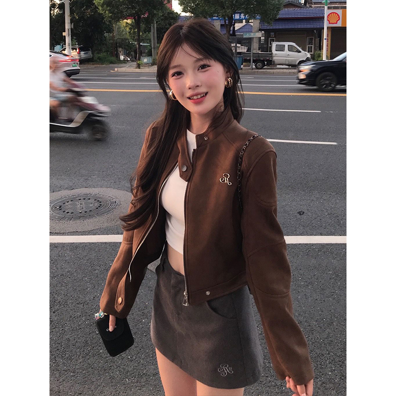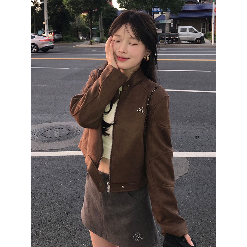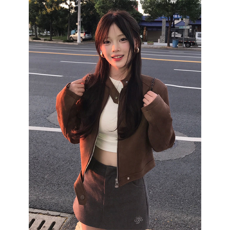 - Top: Cropped suede flight jacket with front zipper, structured shoulders, slim-fit silhouette, autumn-ready fabric.