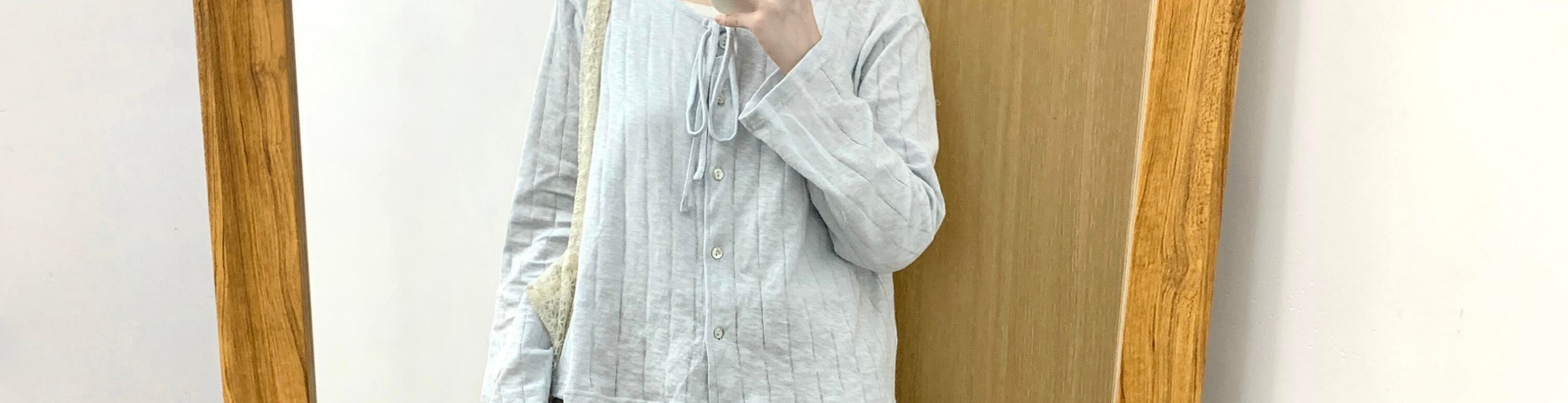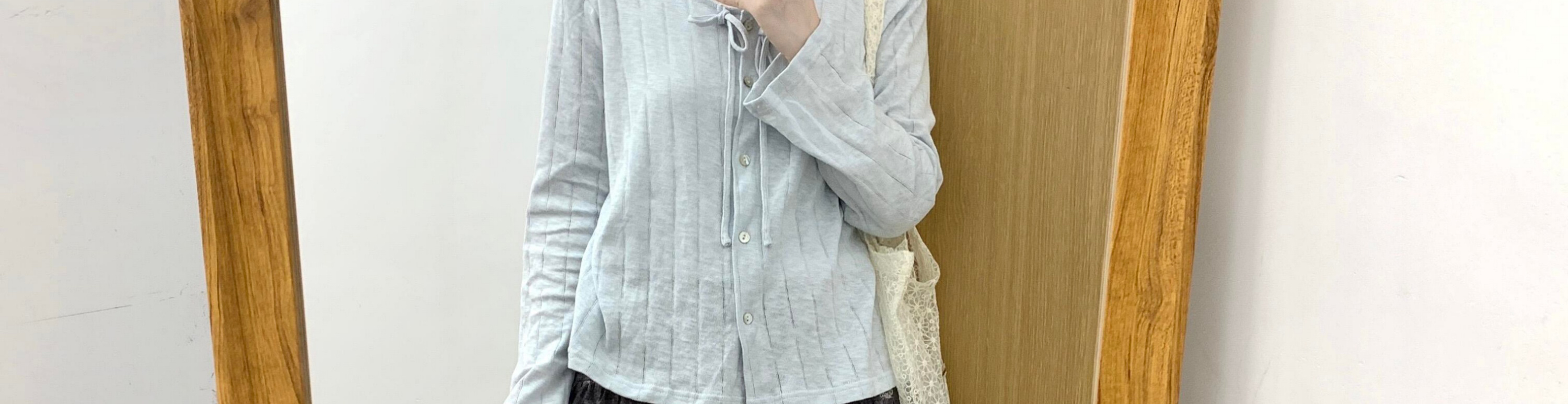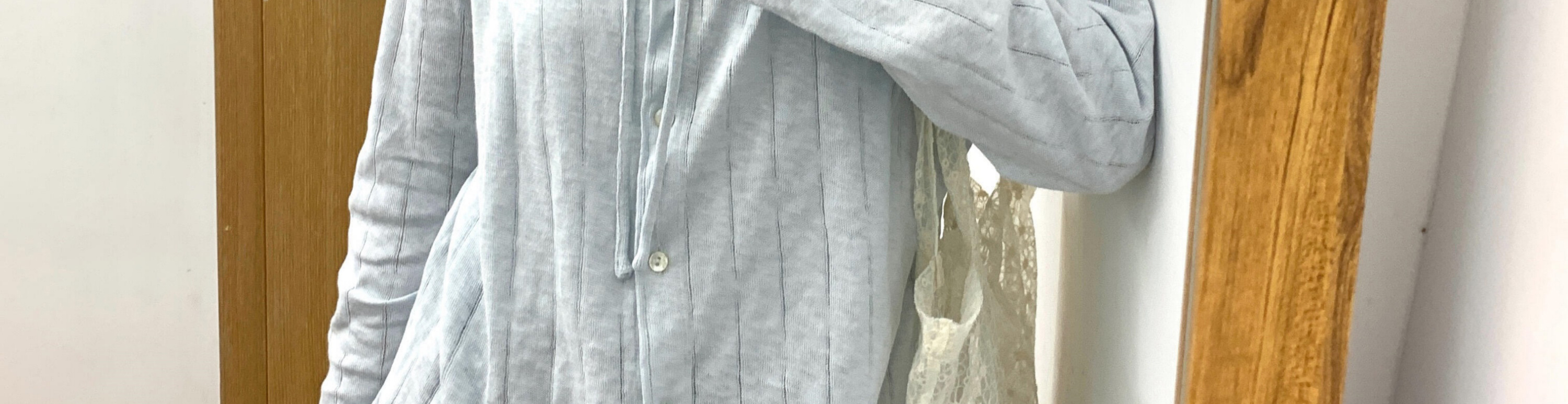 Soft misty blue knit cardigan with tie-front detail. Lightweight and casual for early autumn layering.