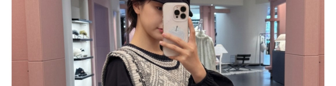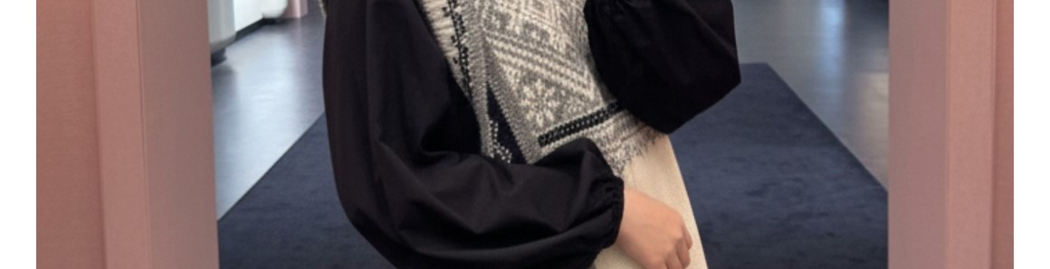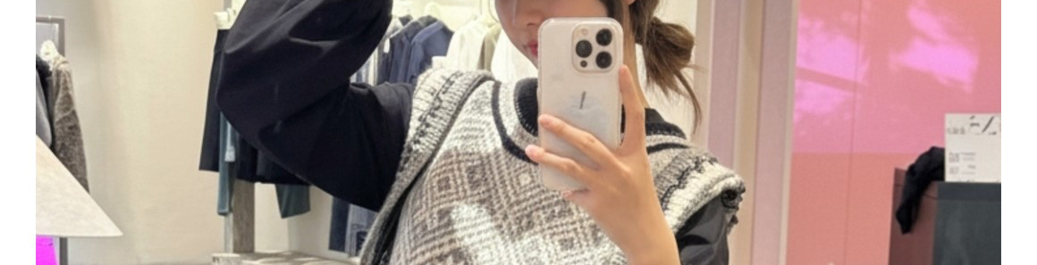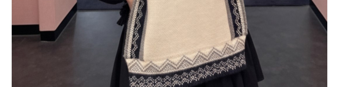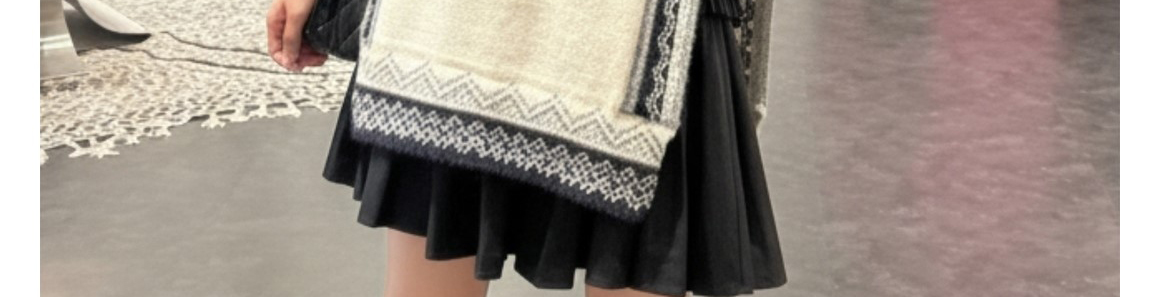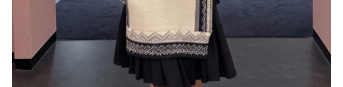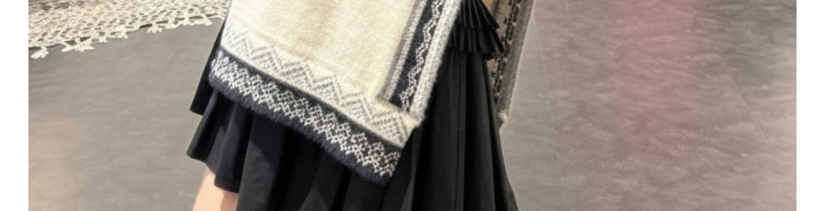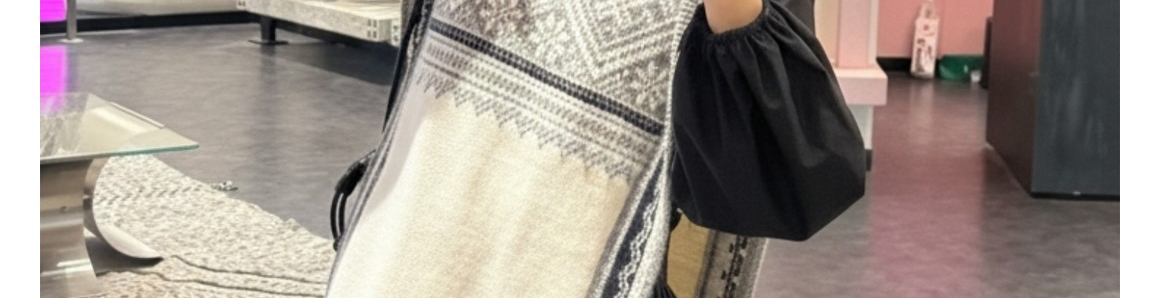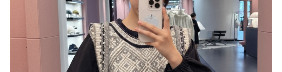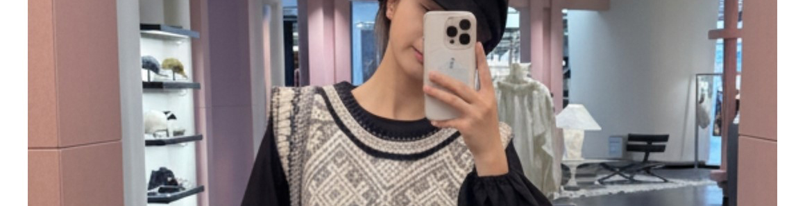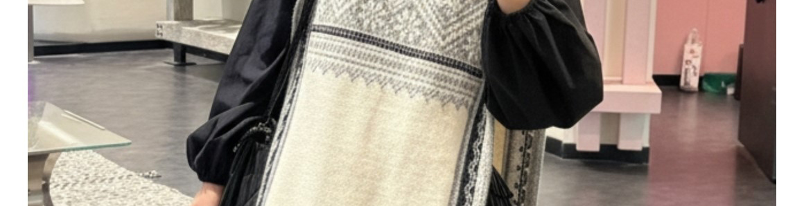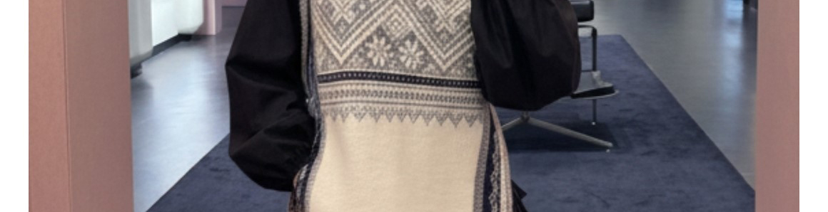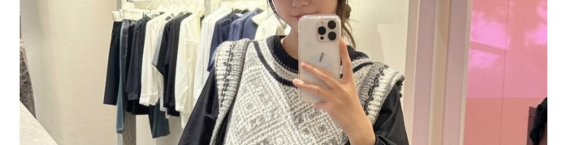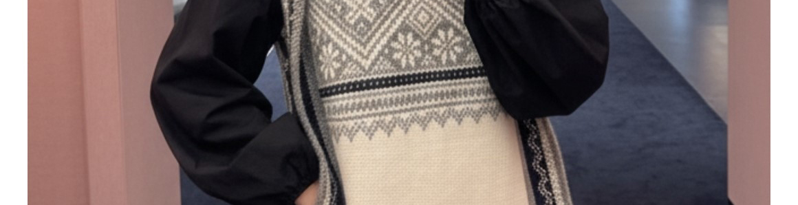 - Top: Vintage-inspired Fair Isle knit vest with blue, white, and gray stripes, soft fabric and relaxed fit.