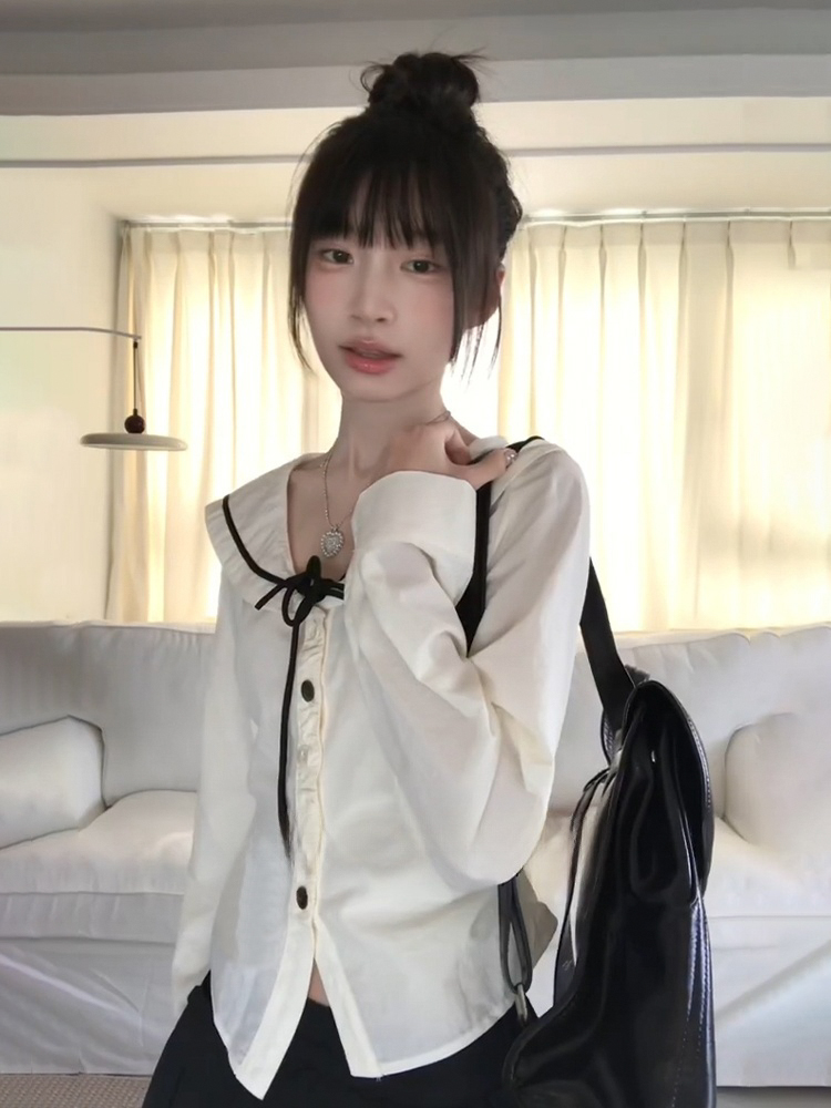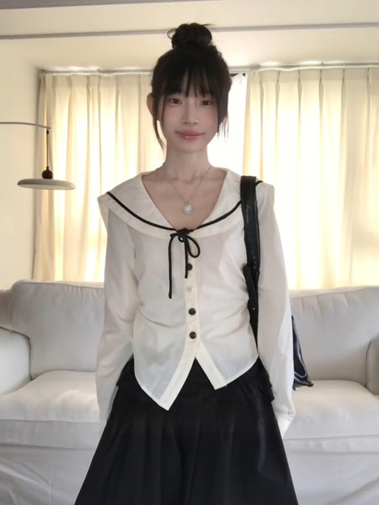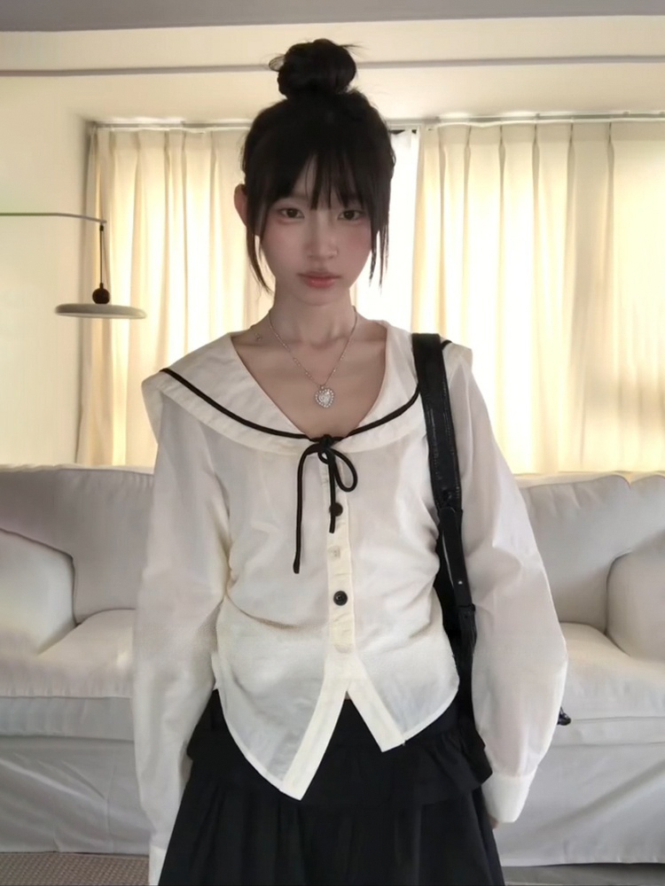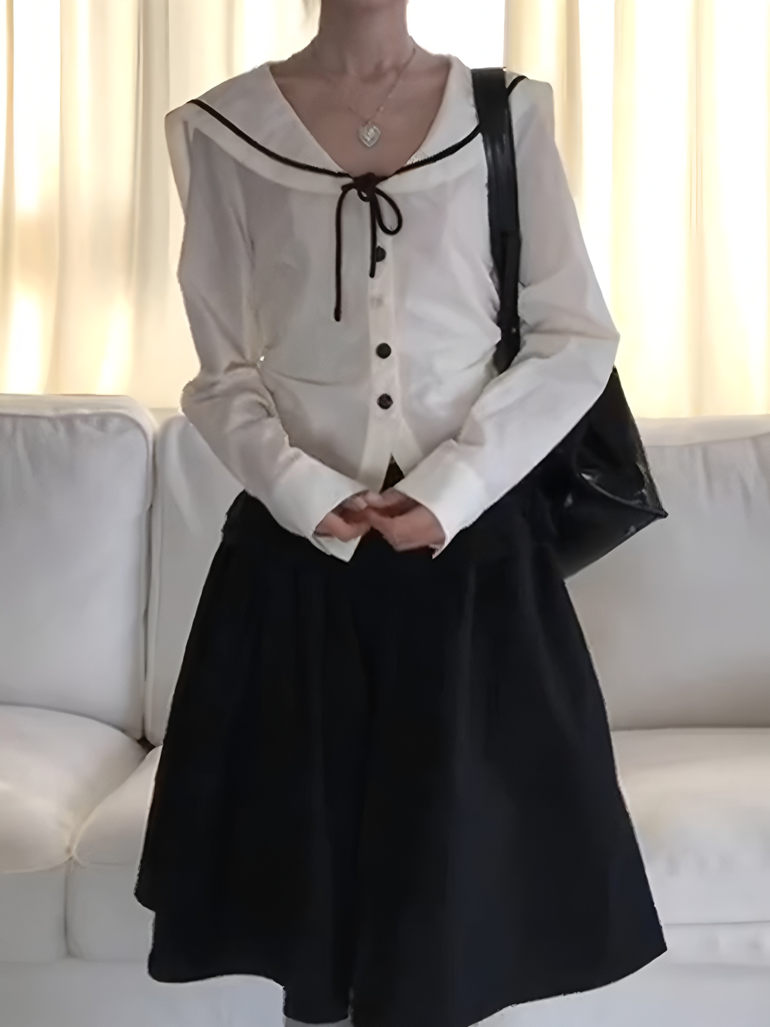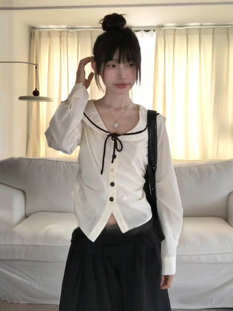 - Top: Long-sleeve navy-collared shirt with asymmetrical hem and cinched waist for a youthful, preppy look.
