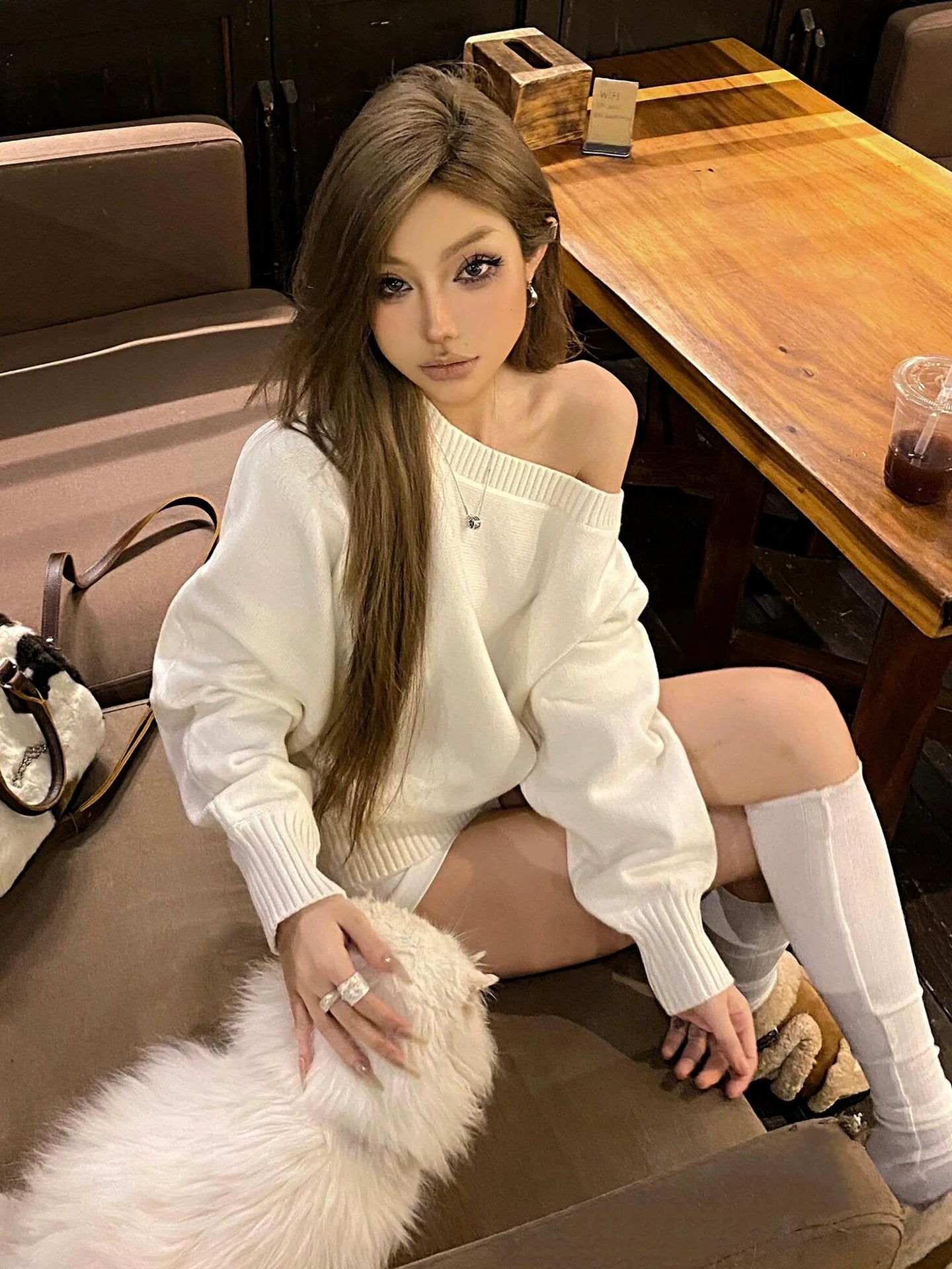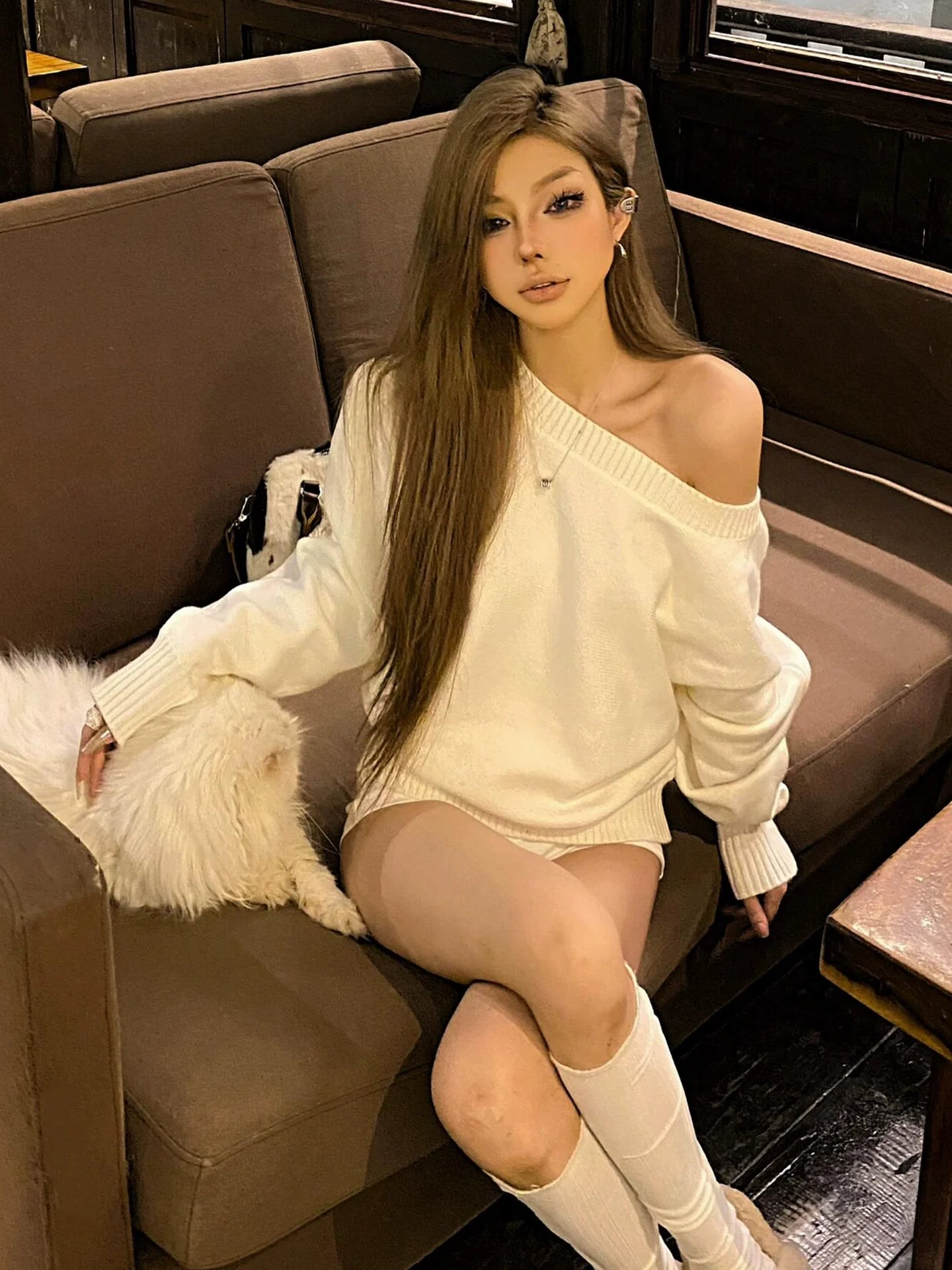 Off-Shoulder Relaxed Knit Sweater Soft Drape Elegant Lazy Fit