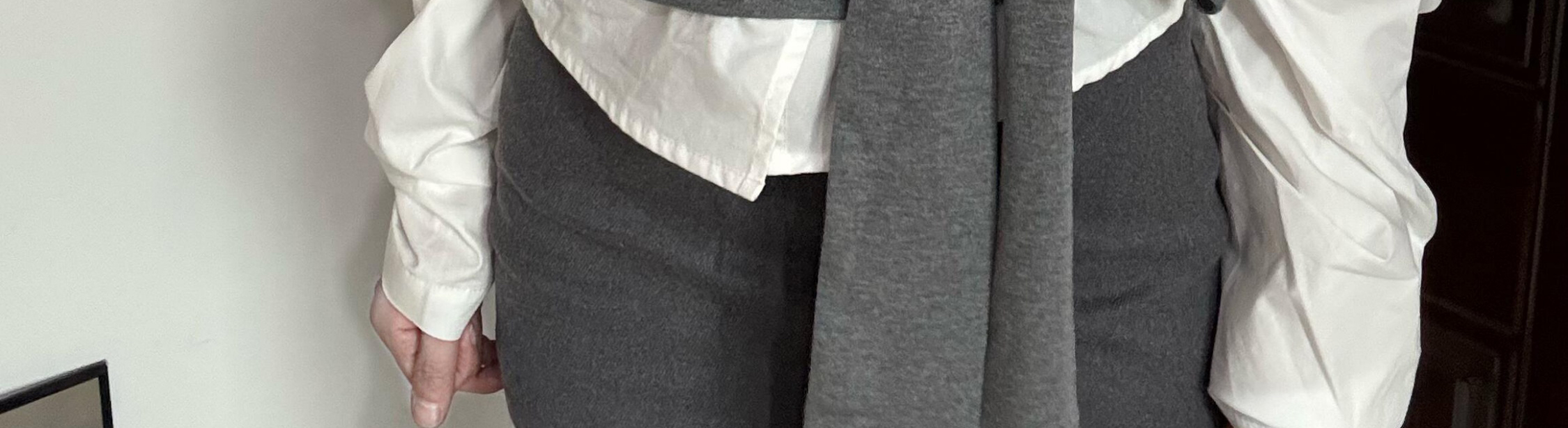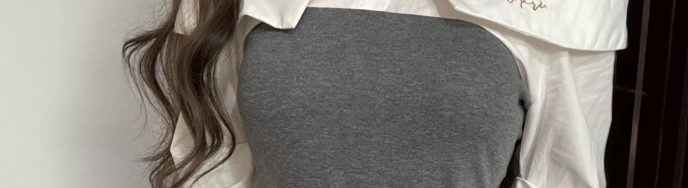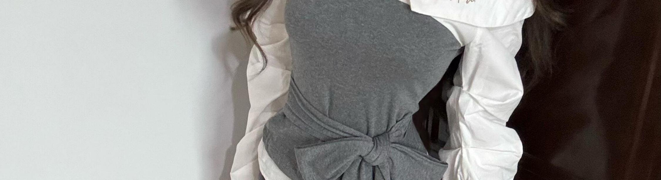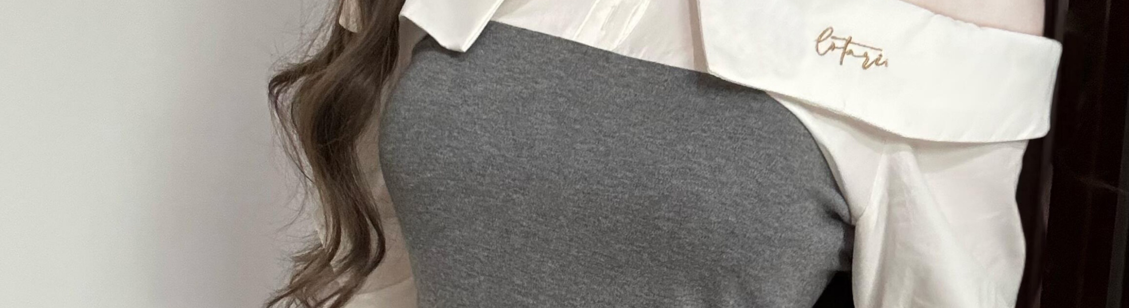 Off-shoulder long sleeve shirt with contrast patch and waist tie. Slim fit and stylish for autumn.