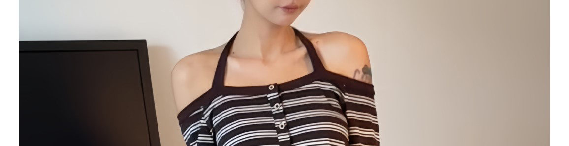 Long sleeve off-shoulder tee with halter design. Loose fit, chic and trendy for autumn.