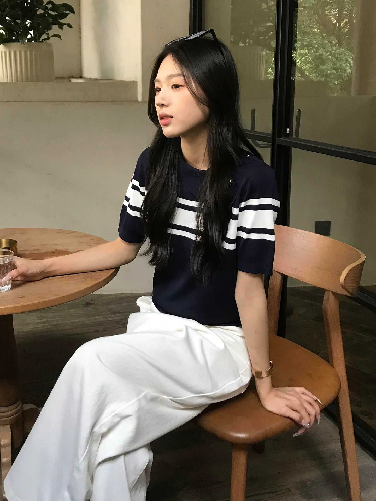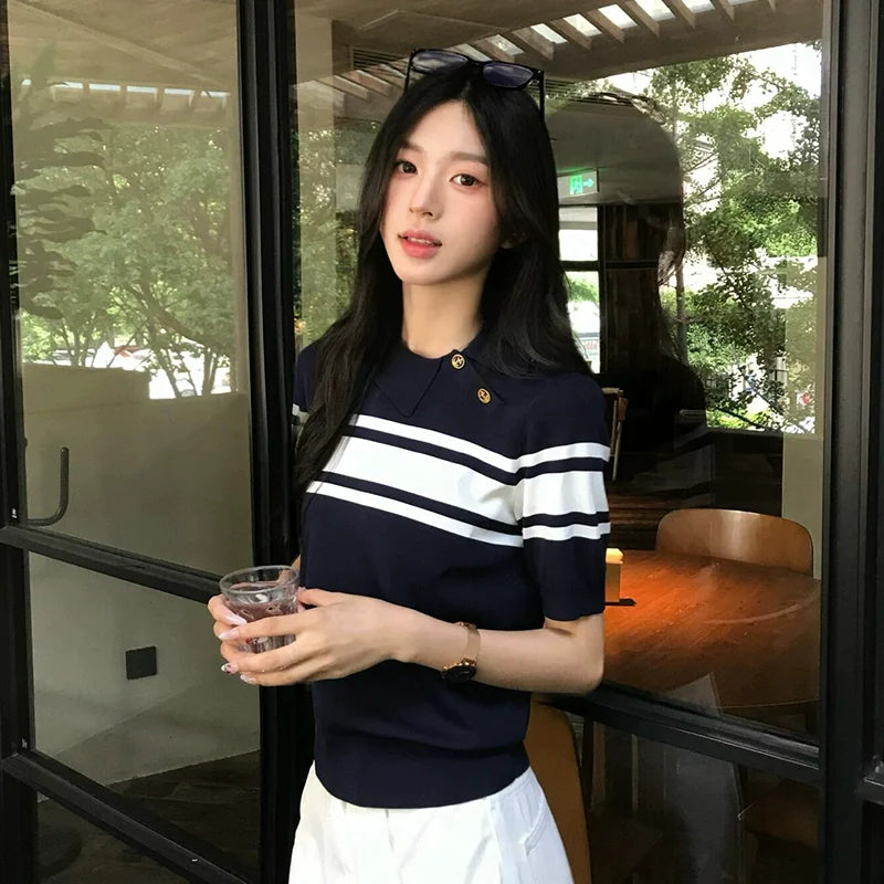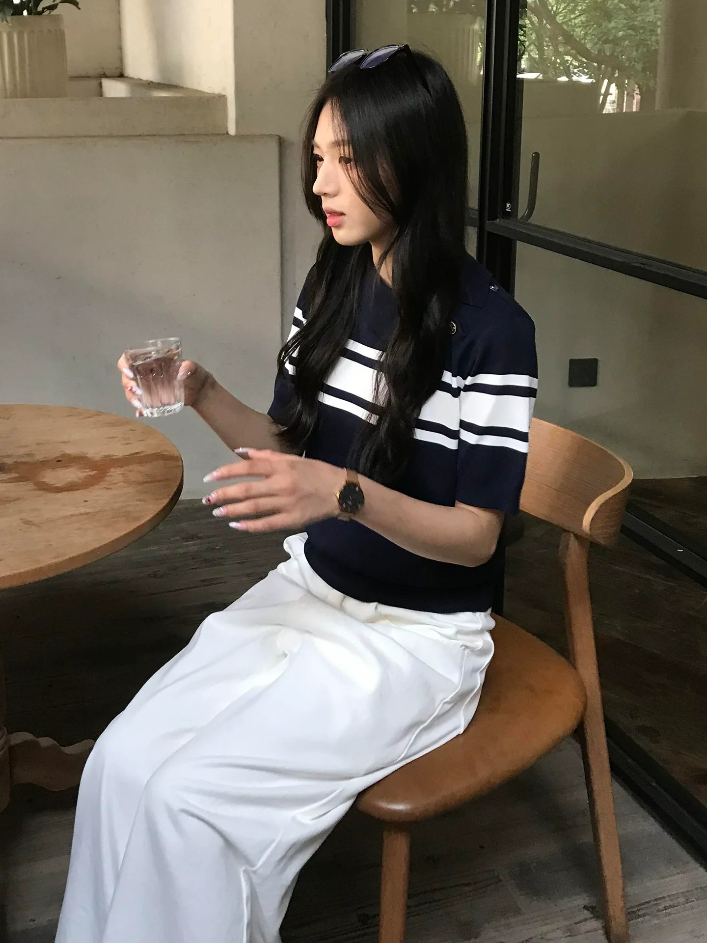 - Top: Classic knit polo shirt with structured shoulders, waist-slimming silhouette, and soft navy fabric for timeless elegance.