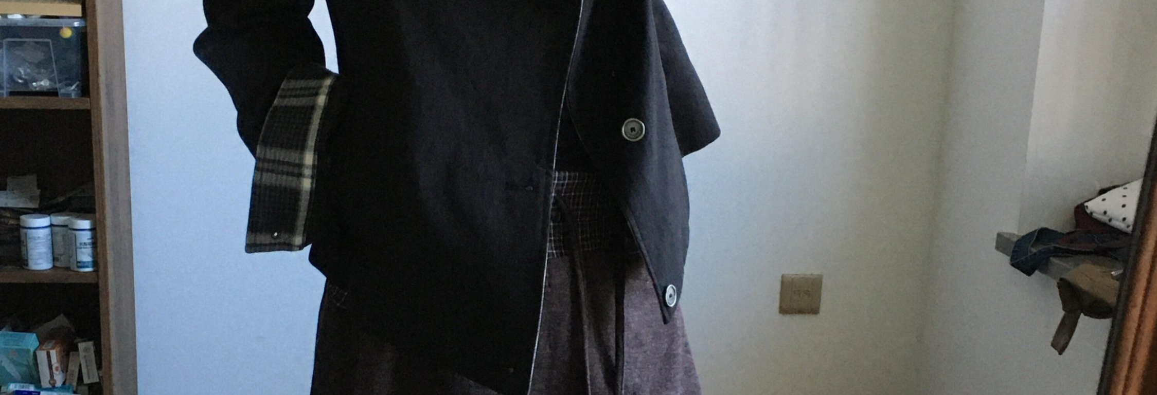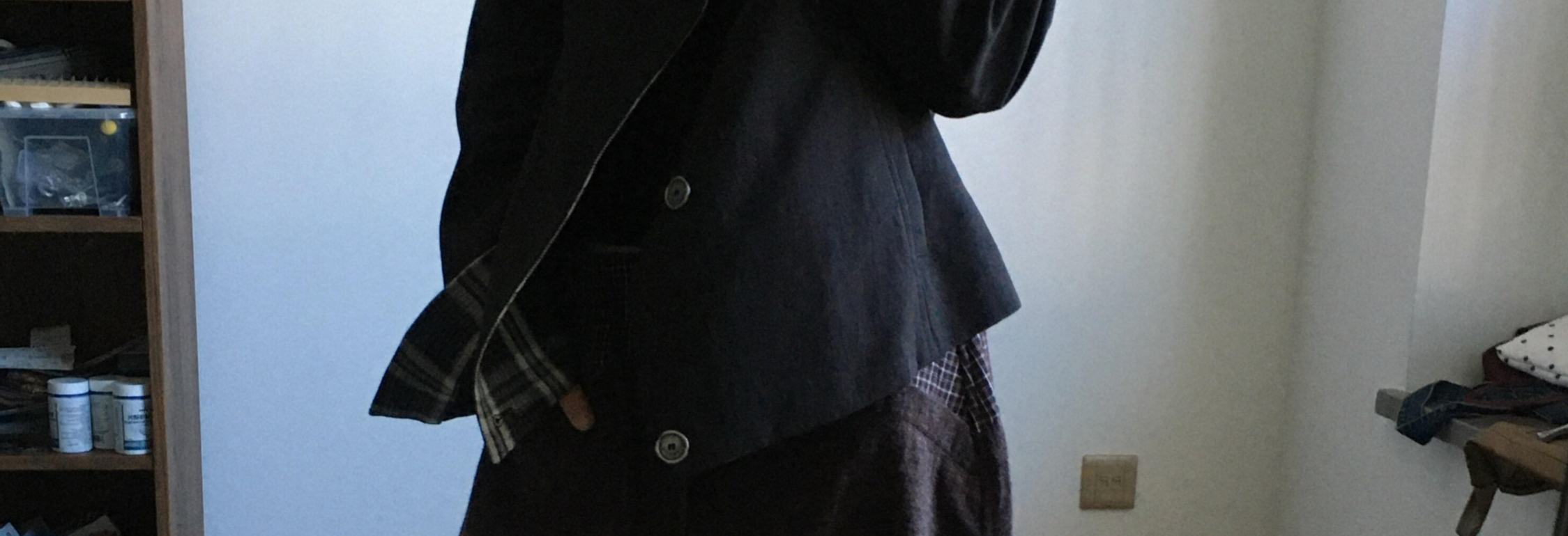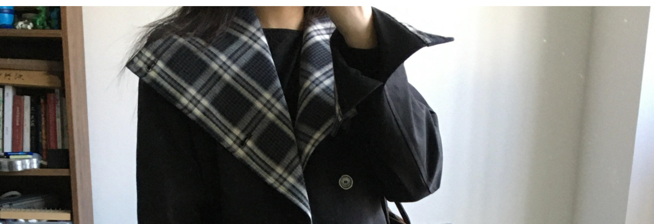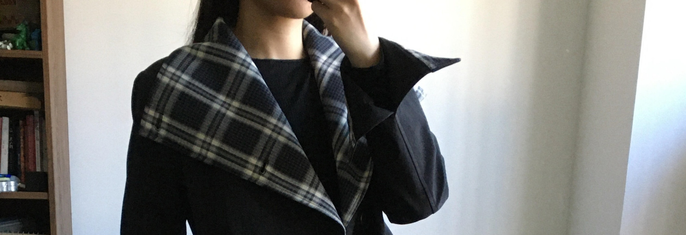 Biker jacket with oversized collar, plaid patch and shoulder pads. Short length, chic and casual for autumn.