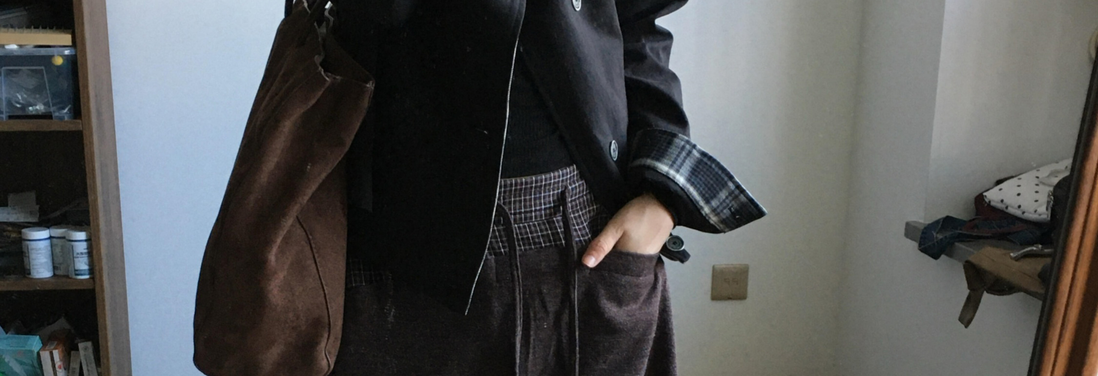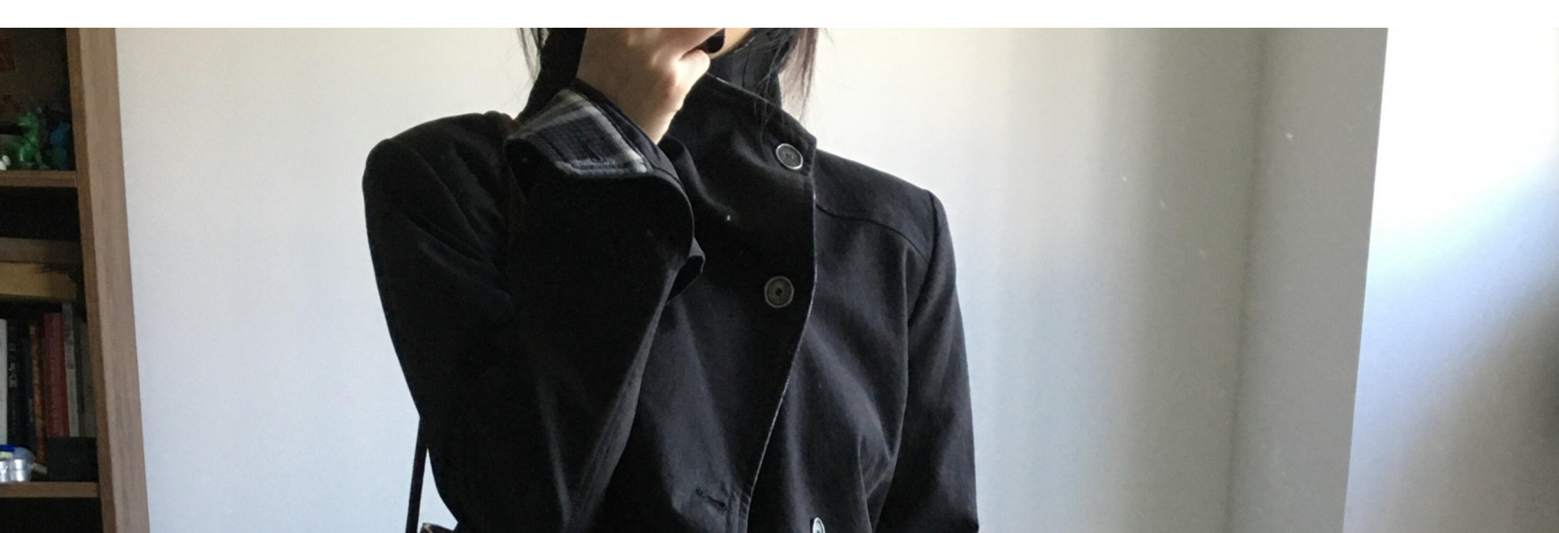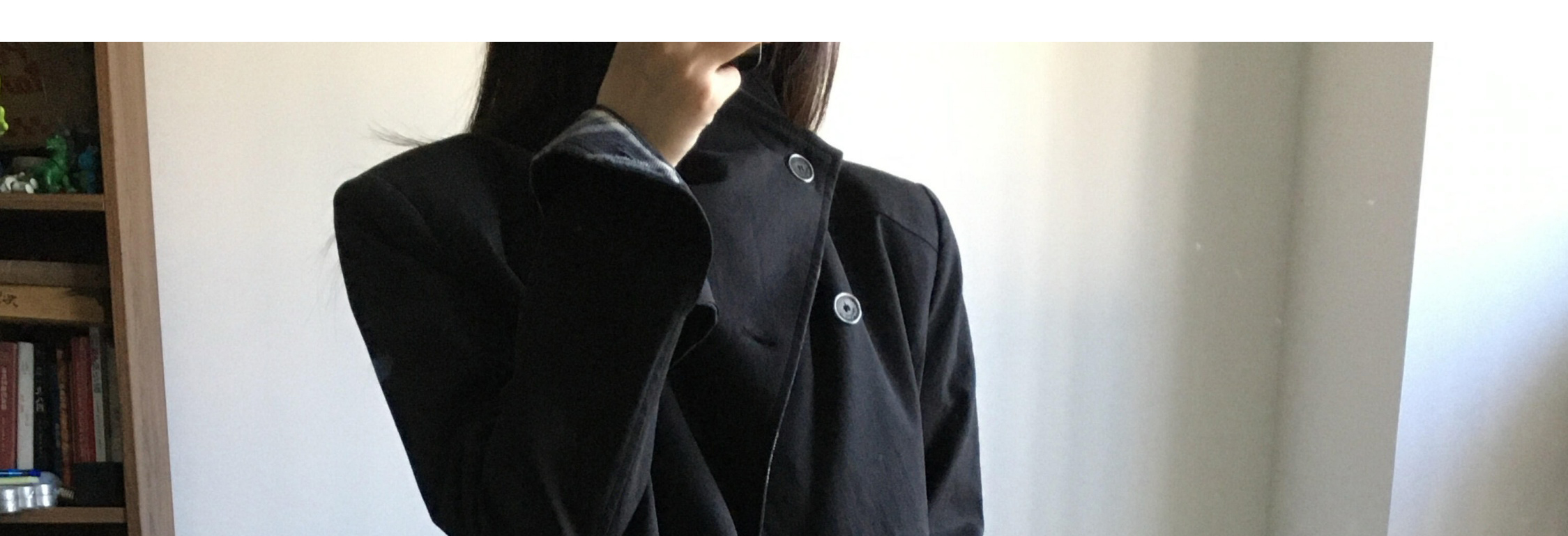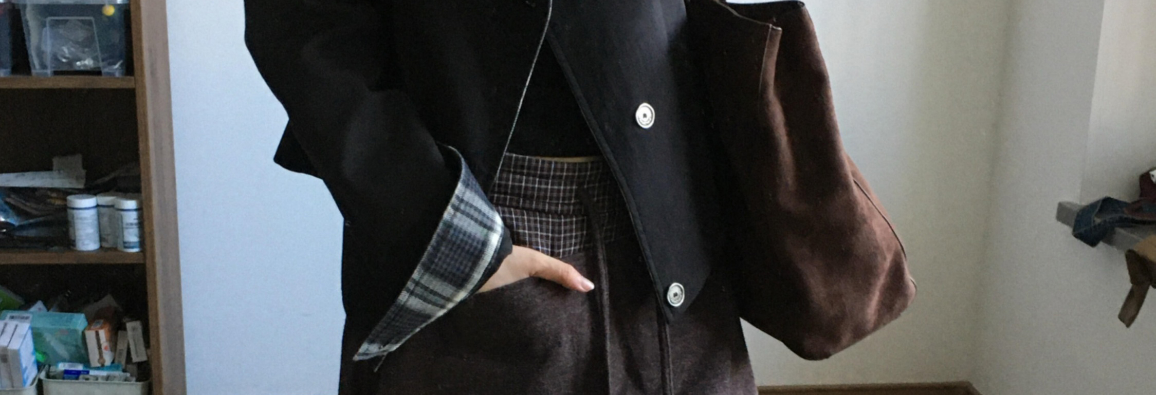 Biker jacket with oversized collar, plaid patch and shoulder pads. Short length, chic and casual for autumn.