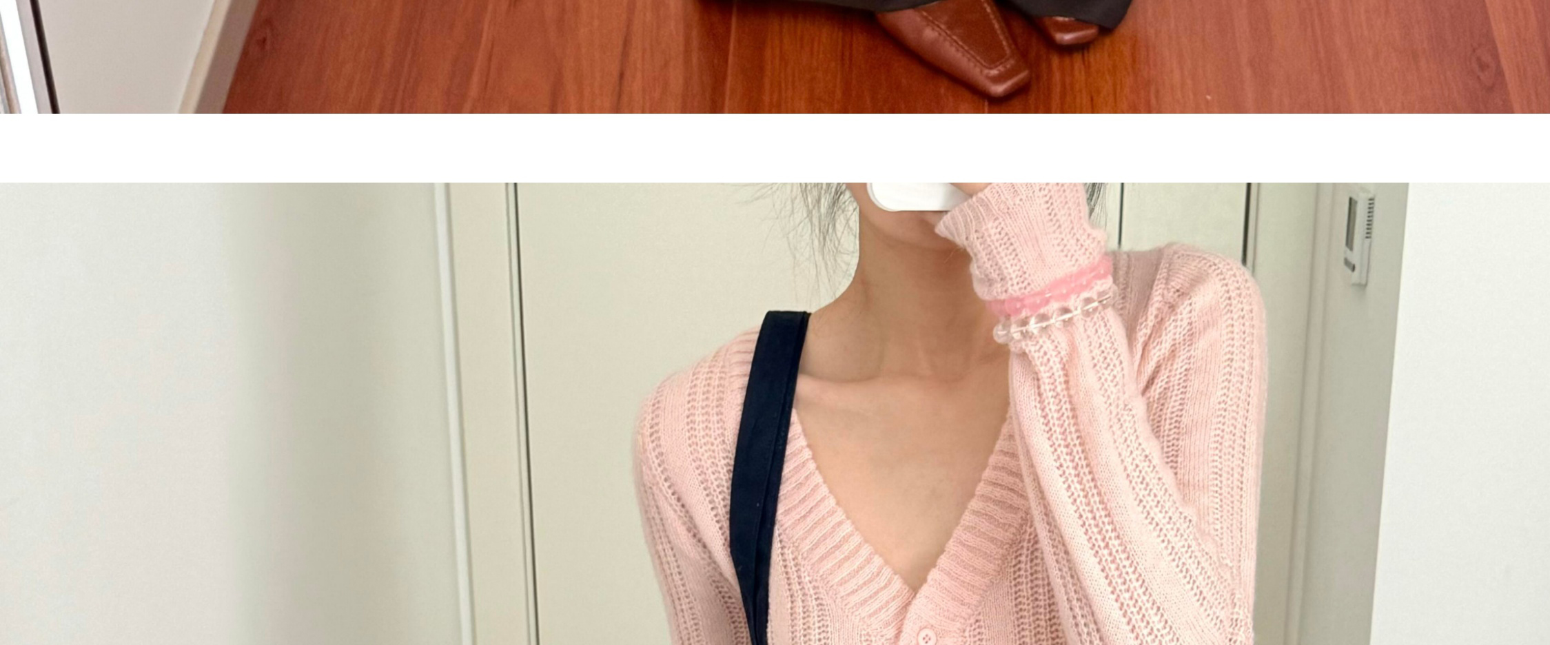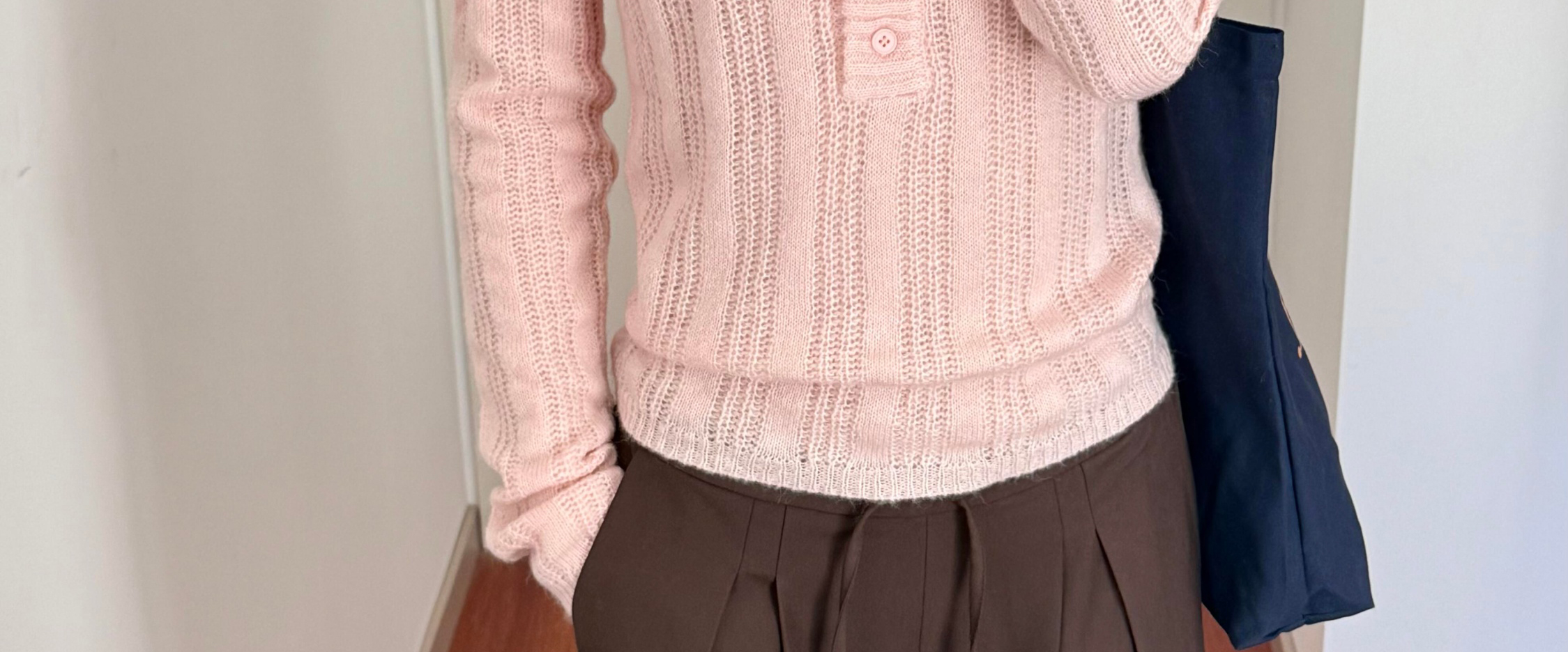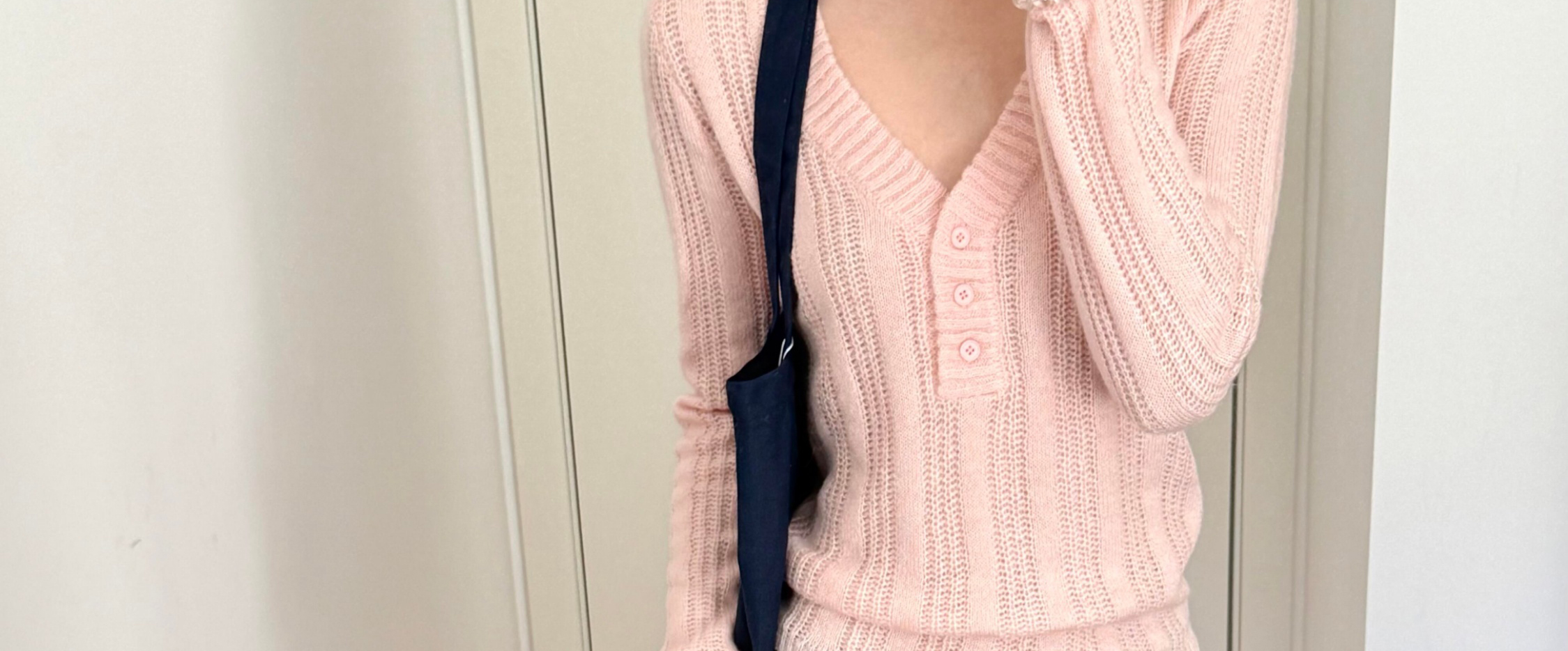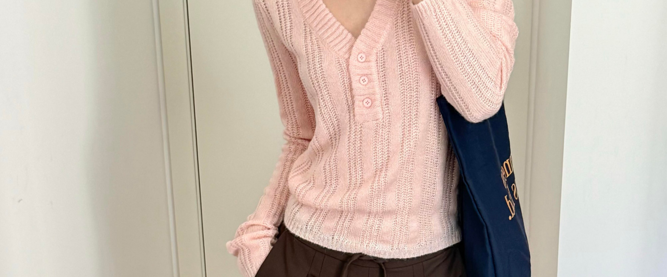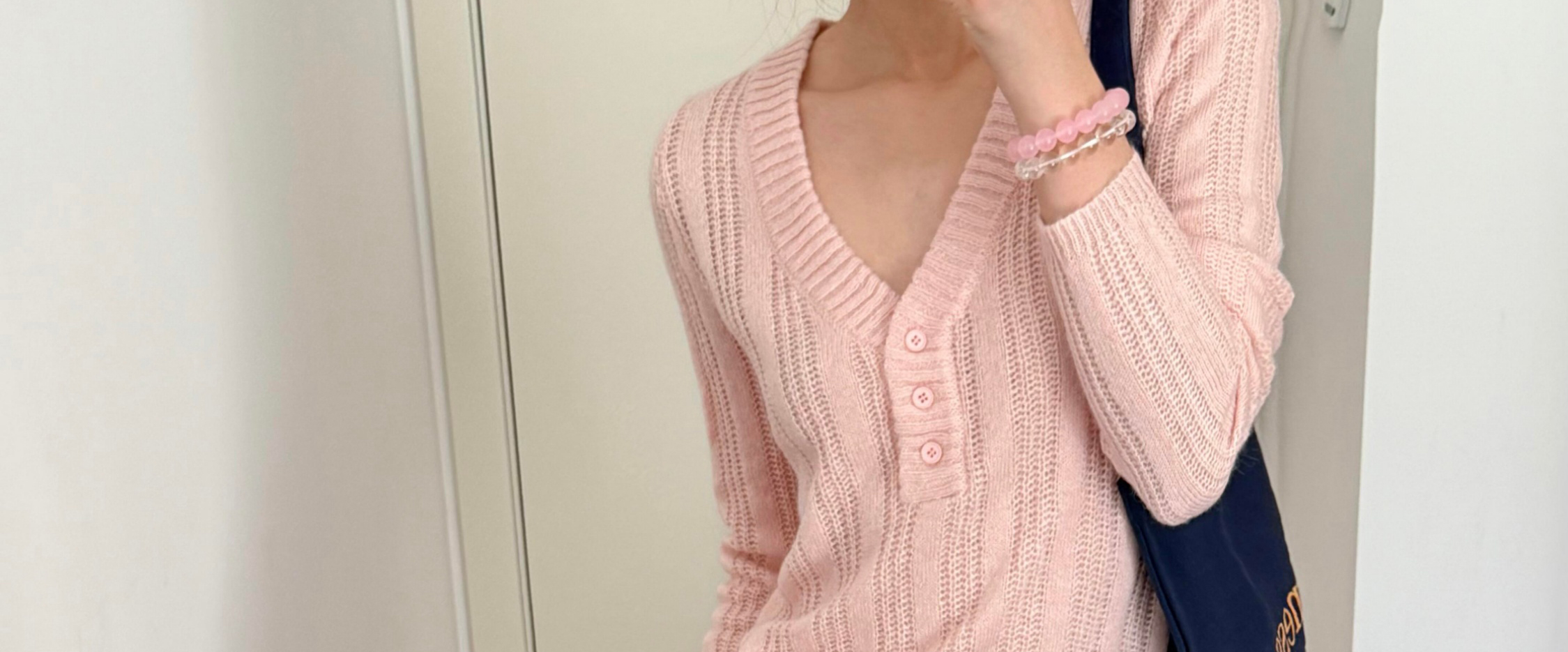 Light pink V-neck knit sweater with vertical hollow pattern. Soft and relaxed fit for casual autumn looks.