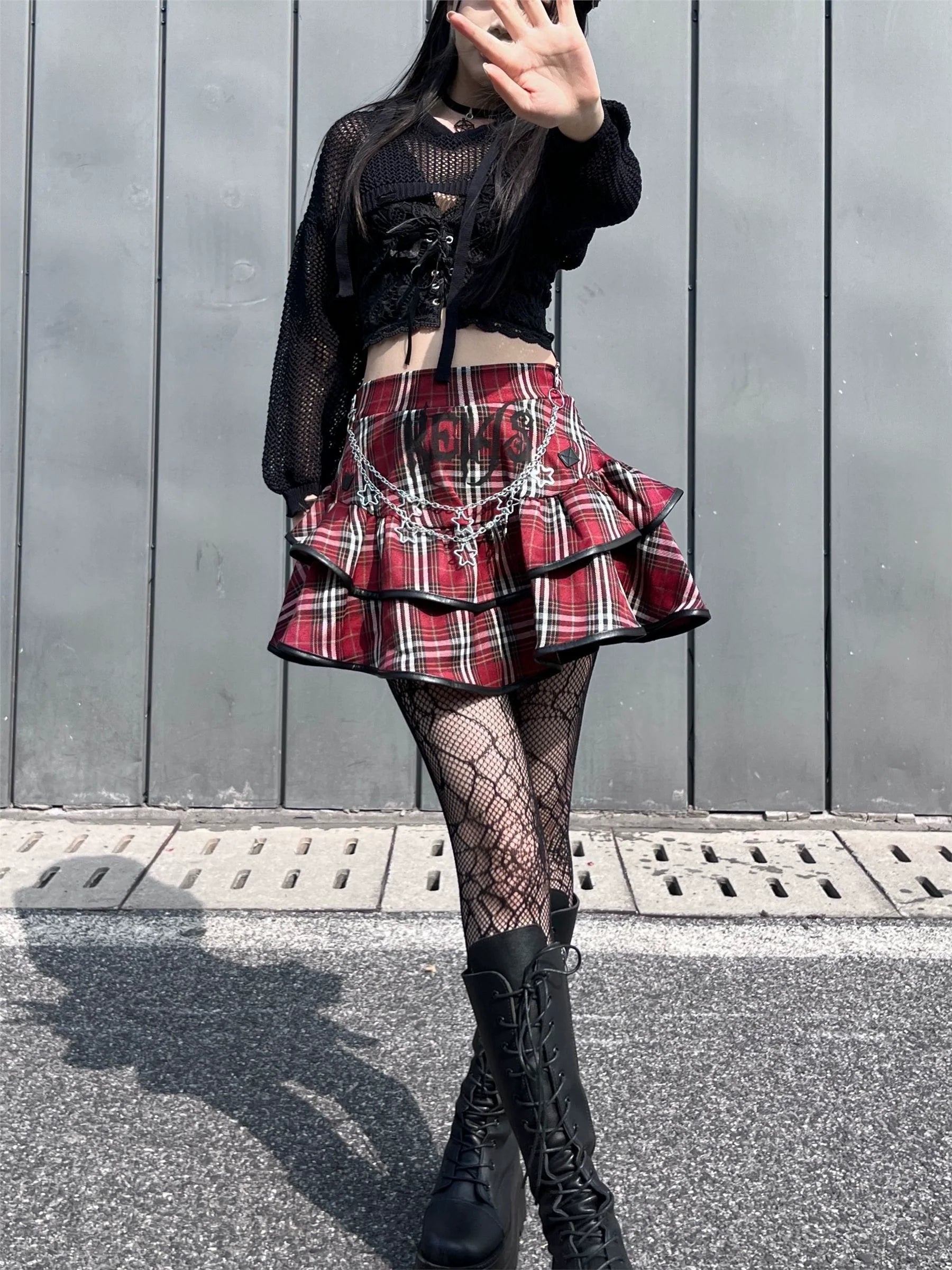 - Skirt: Short, high-waisted cake skirt with retro plaid and included chain accessory, blending punk, Gothic rock, and Y2K subculture. Edgy for cool seasons.