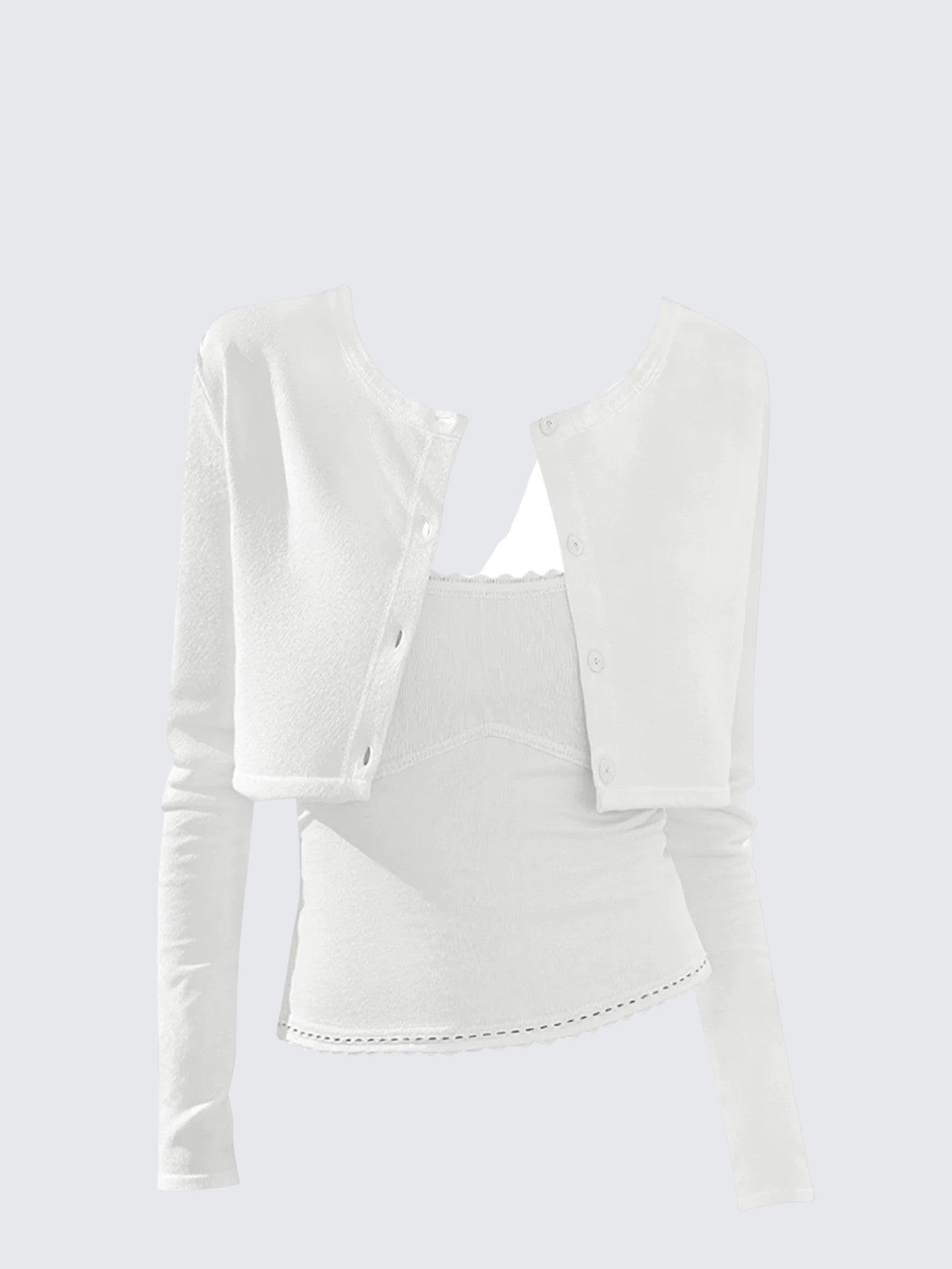 - Top: Two-piece set with plaid contrast cardigan and fitted camisole, slim fit.