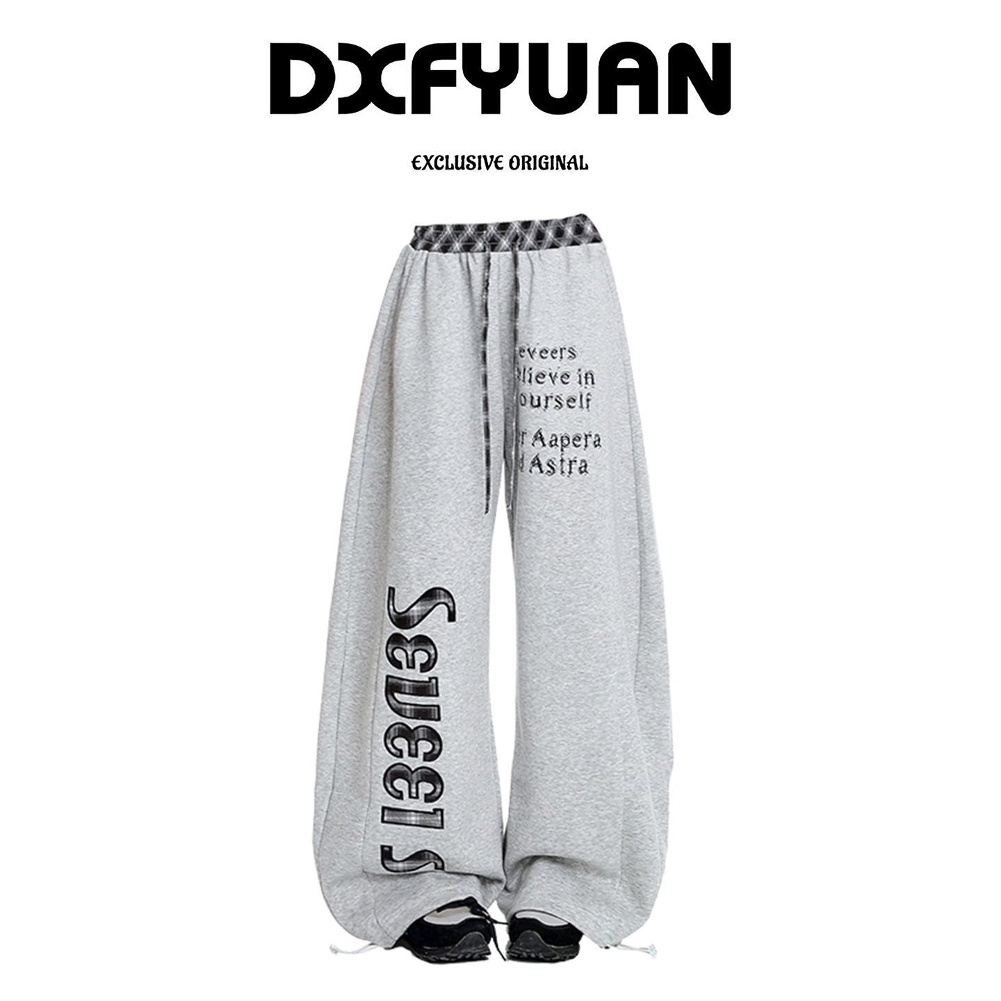 Retro plaid patch sweatpants with relaxed fit and curved leg design. Comfortable and casual for early autumn.