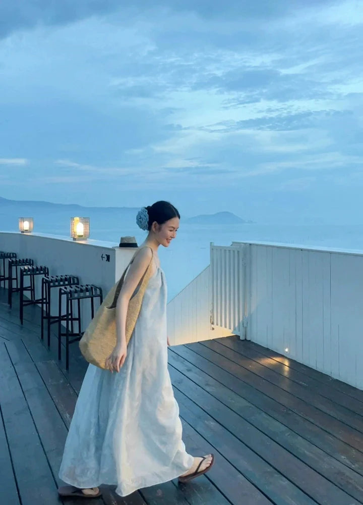 - Dress: Long spaghetti-strap dress for summer, made from pleated Tencel fabric, featuring a backless design, a relaxed fit, and subtle jacquard detailing—crafted for a luxe, laid-back beach vibe.