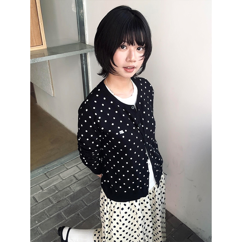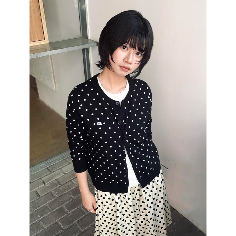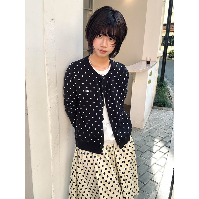 Polka-dot knit cardigan with contrast color and layered effect. Soft and preppy for a charming autumn look.