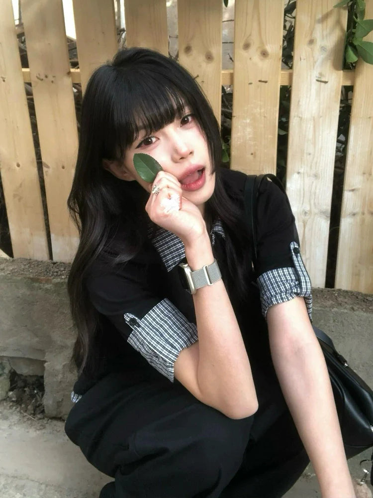Preppy Black Plaid Polo Tee Layered Short Sleeve Fitted Top