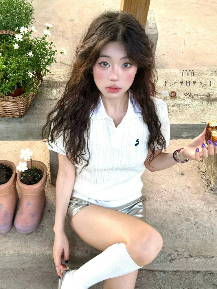 - Top: Preppy short sleeve polo t-shirt with embroidered details, tailored slim fit, soft cotton knit fabric, perfect for summer casual wear.