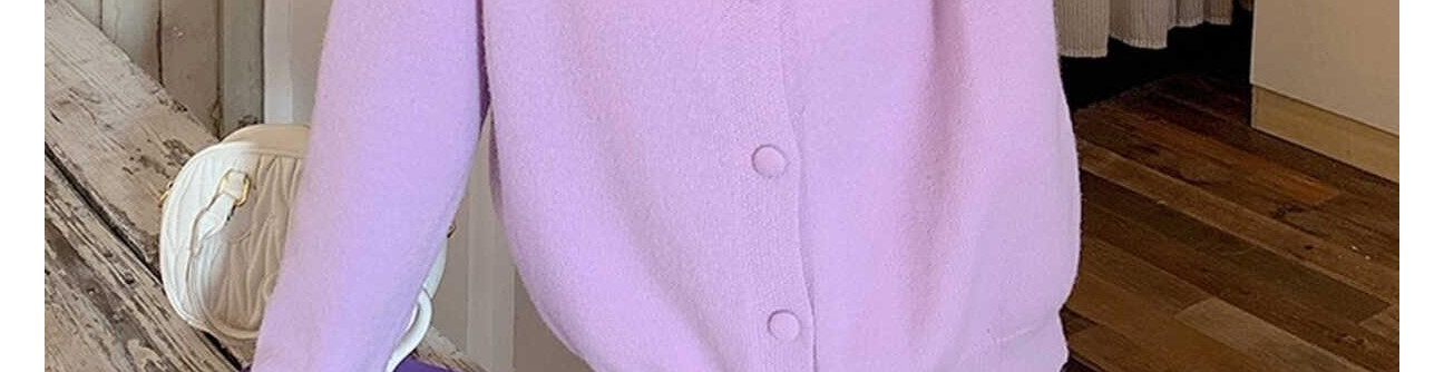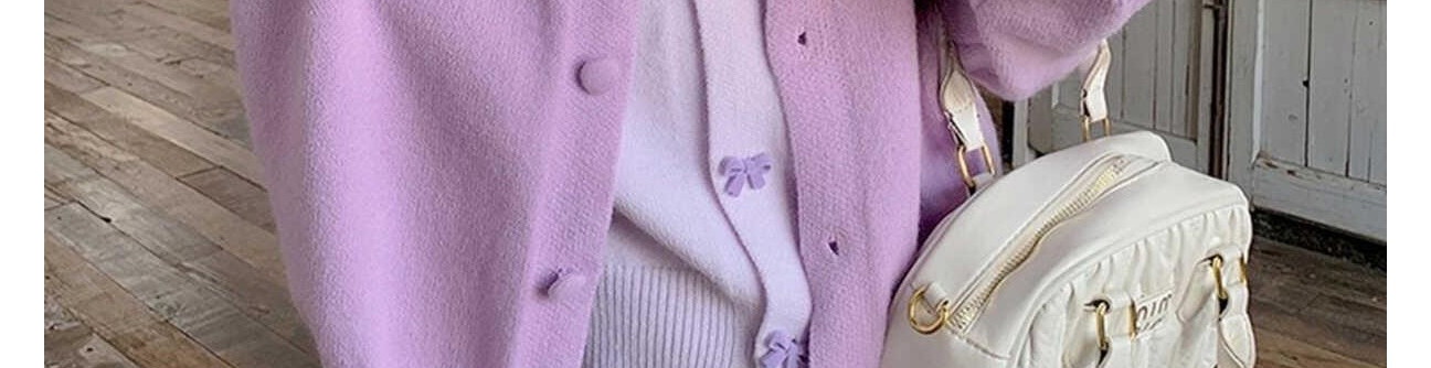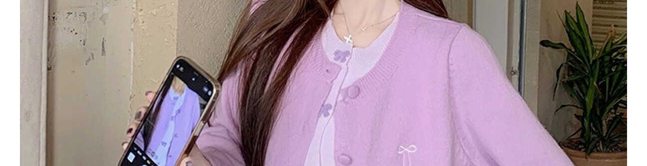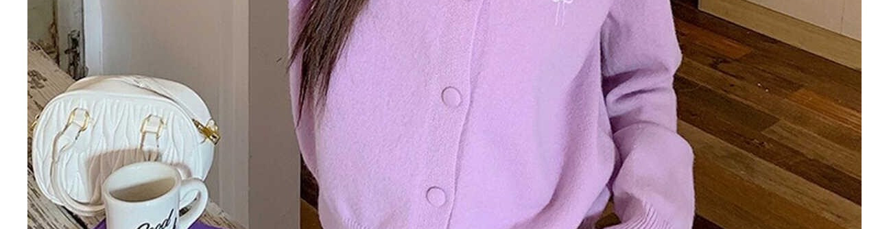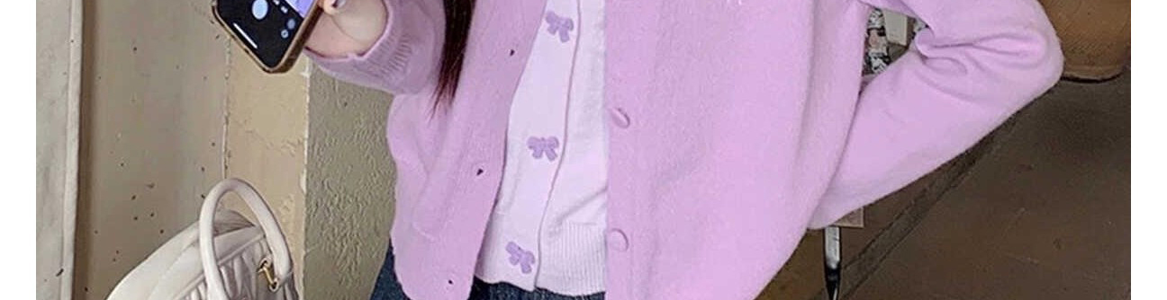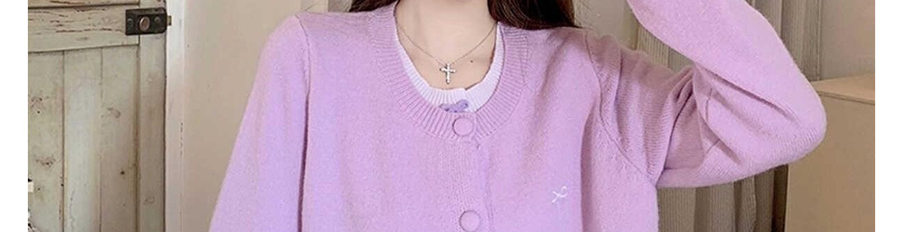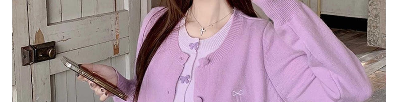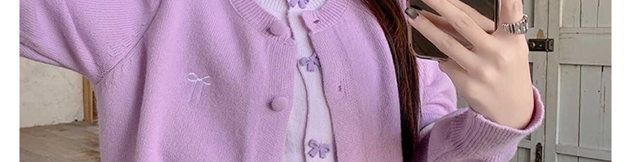 - Cardigan: Autumn knit cardigan with layered design and bow detail, slim-fit, brightening purple shade.