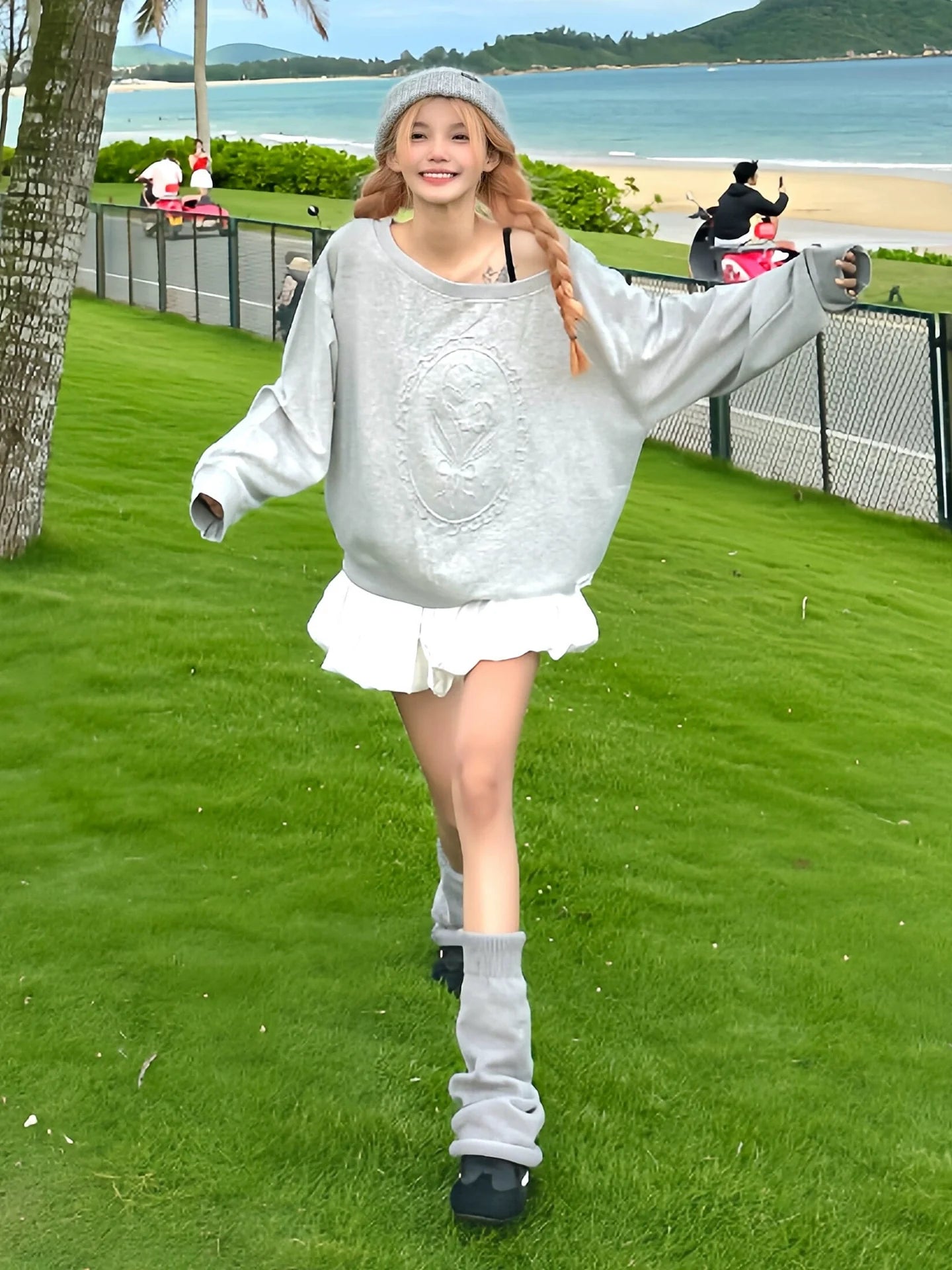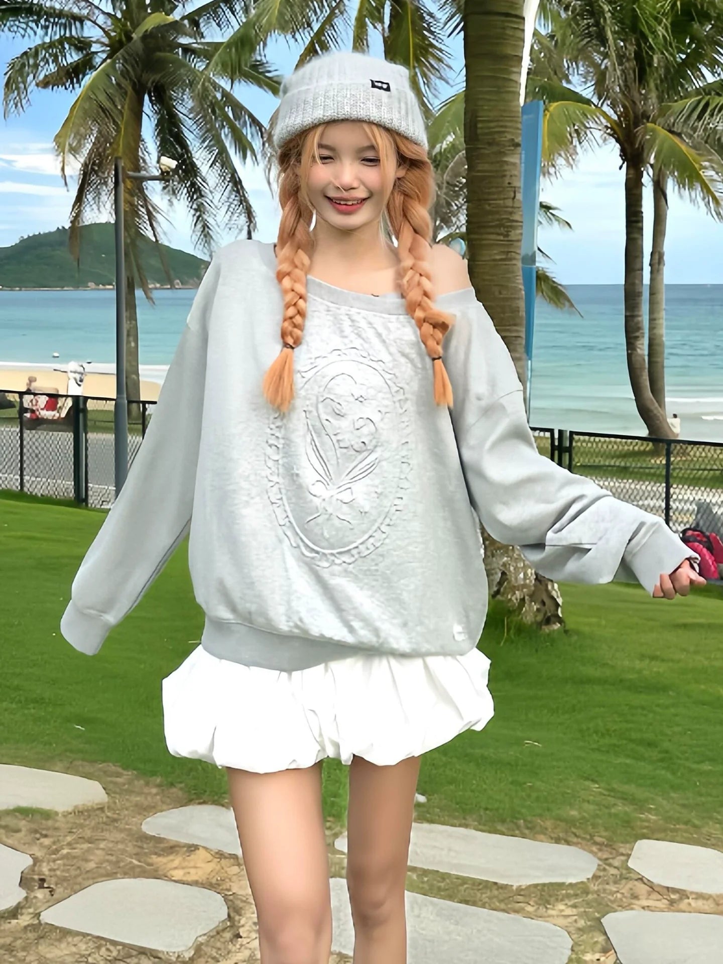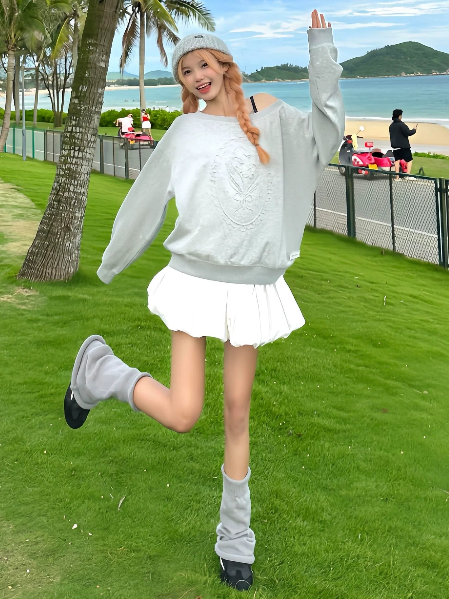 - Top: Autumn-winter gray one-shoulder sweatshirt with embossed floral bouquet, relaxed fit, soft cotton, Y2K vintage style.