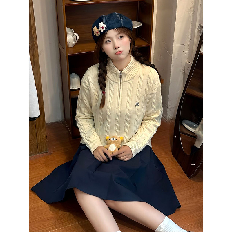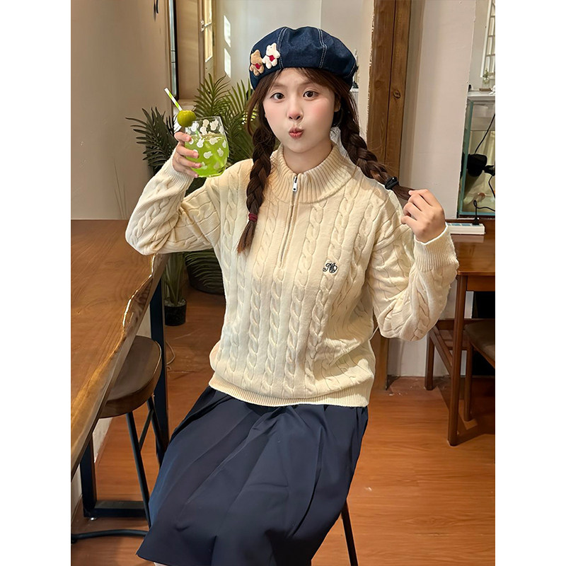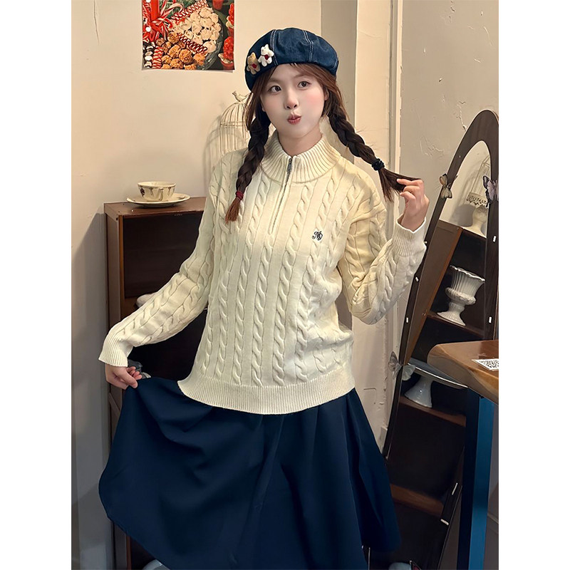 Half-zip cable knit sweater in a cozy texture. Vintage American aesthetic with a relaxed and comfy silhouette.
