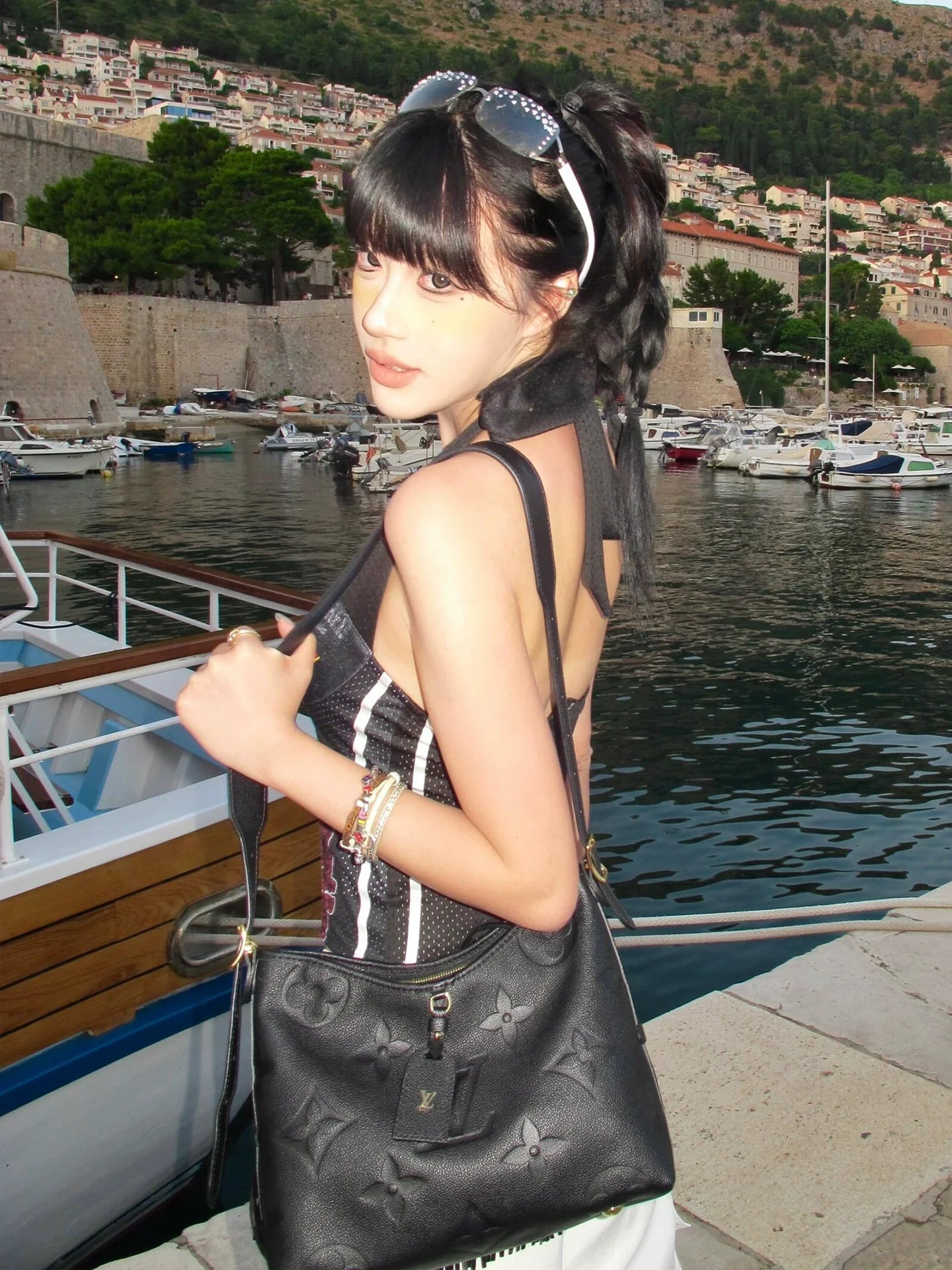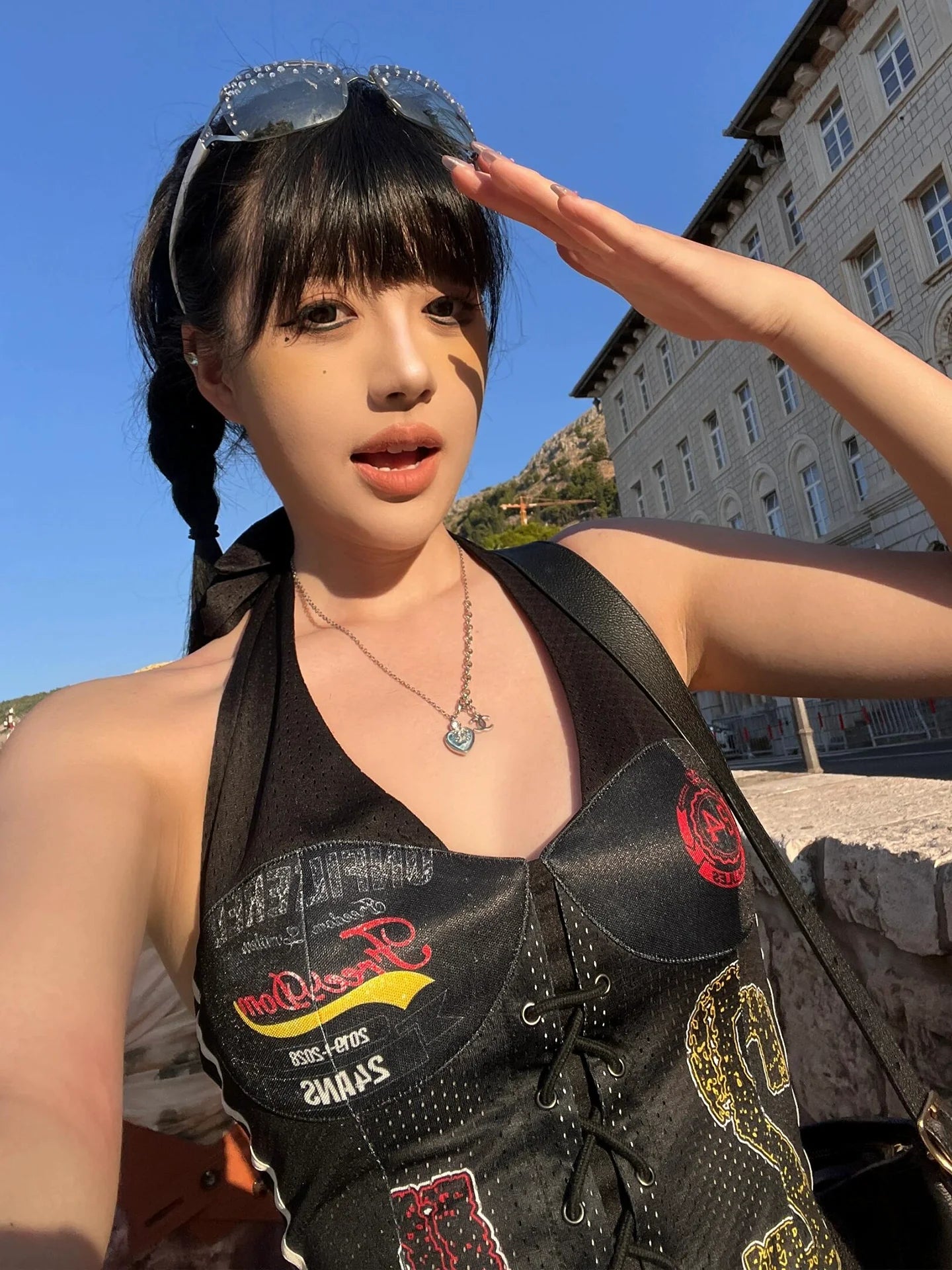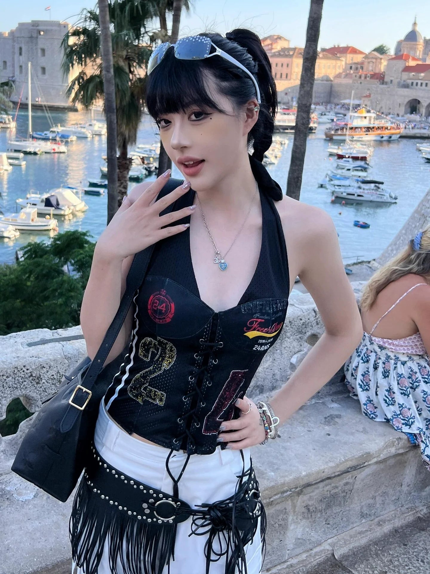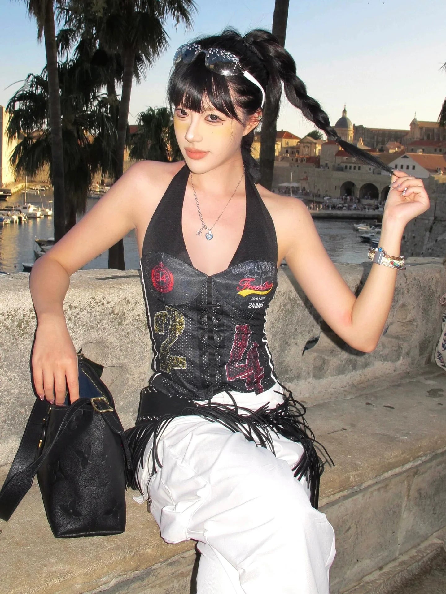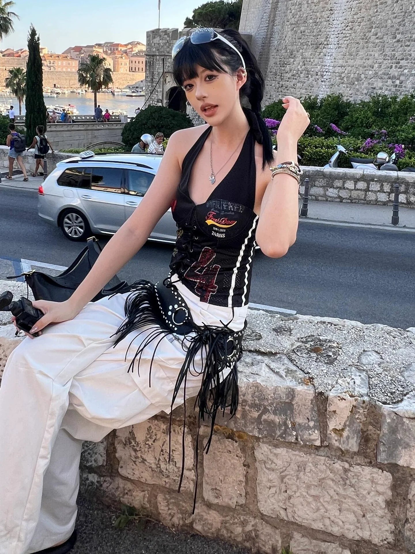 - Top: Asymmetric halter-neck crop tank with jersey texture and contrast stitching for sporty vintage appeal.