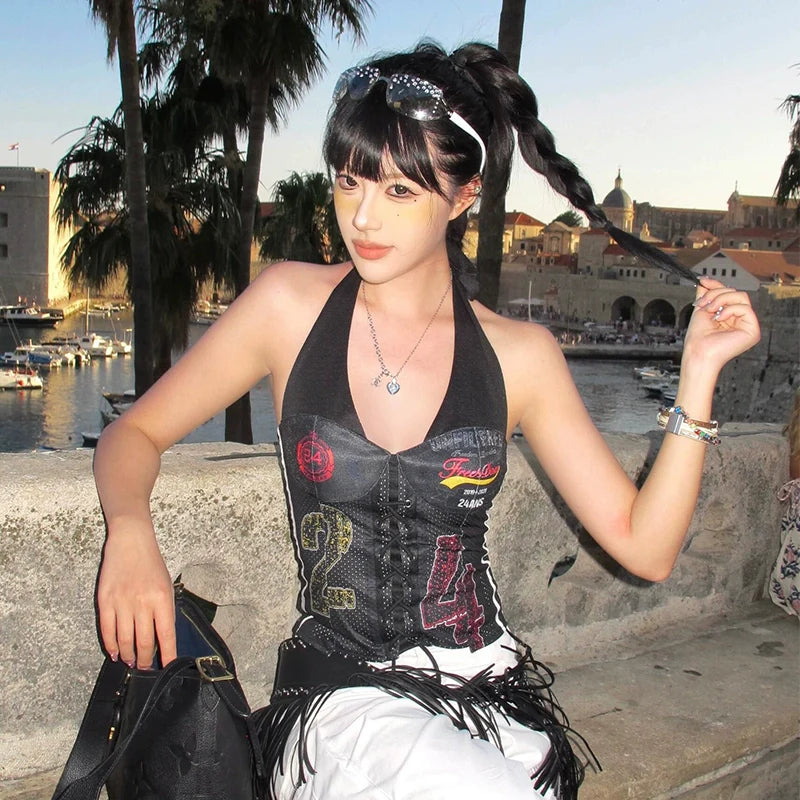 Retro Jersey Halter Crop Tank Asymmetric Hot-Girl Top