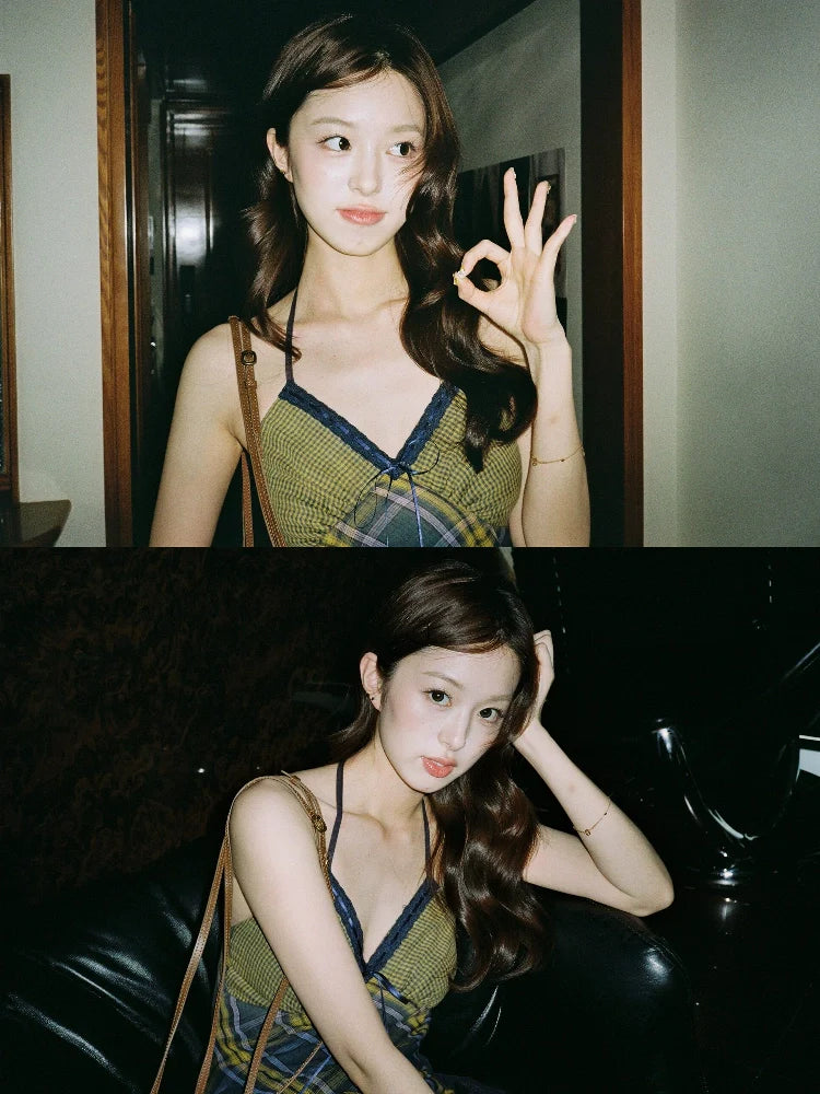 - Dress: Retro plaid mini dress with V-neck, halter straps, and backless design. Lightweight fabric ensures comfortable wear with a nostalgic style.