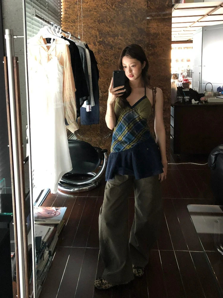 Retro Plaid V-Neck Halter Backless Mini Dress