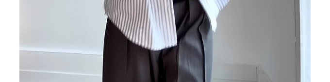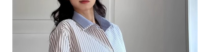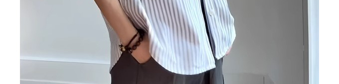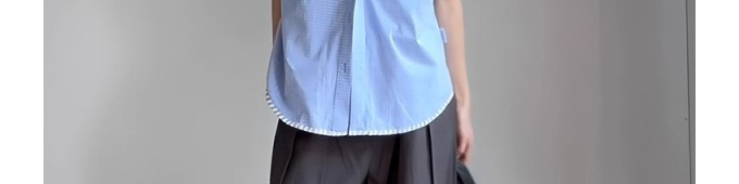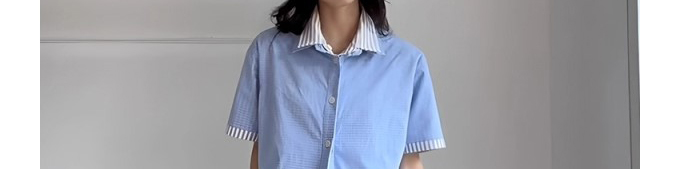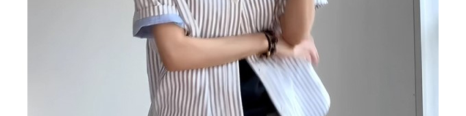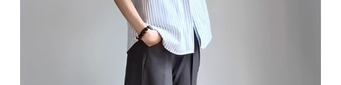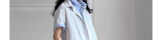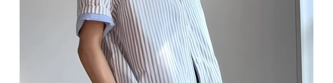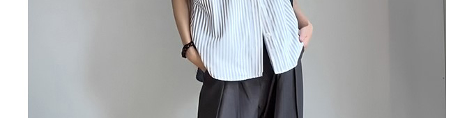 - Top: Short sleeve reversible shirt with blue-gray stripe pattern, lightweight summer fabric, versatile design.