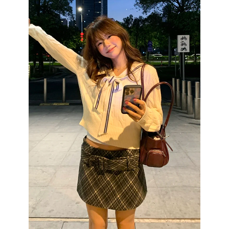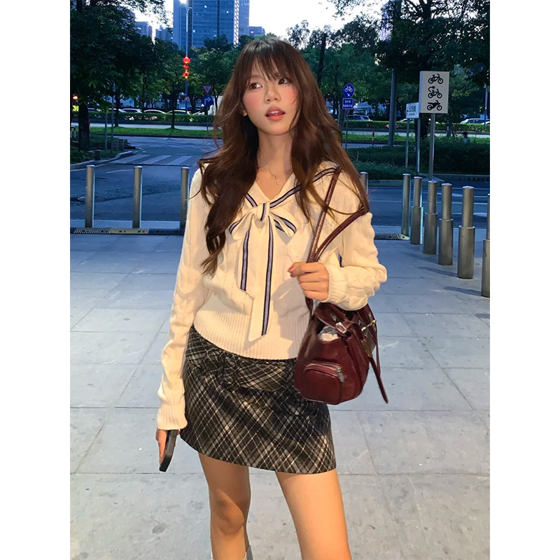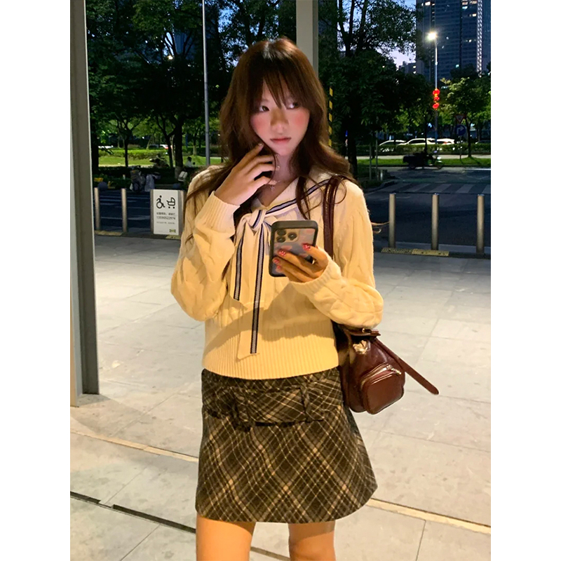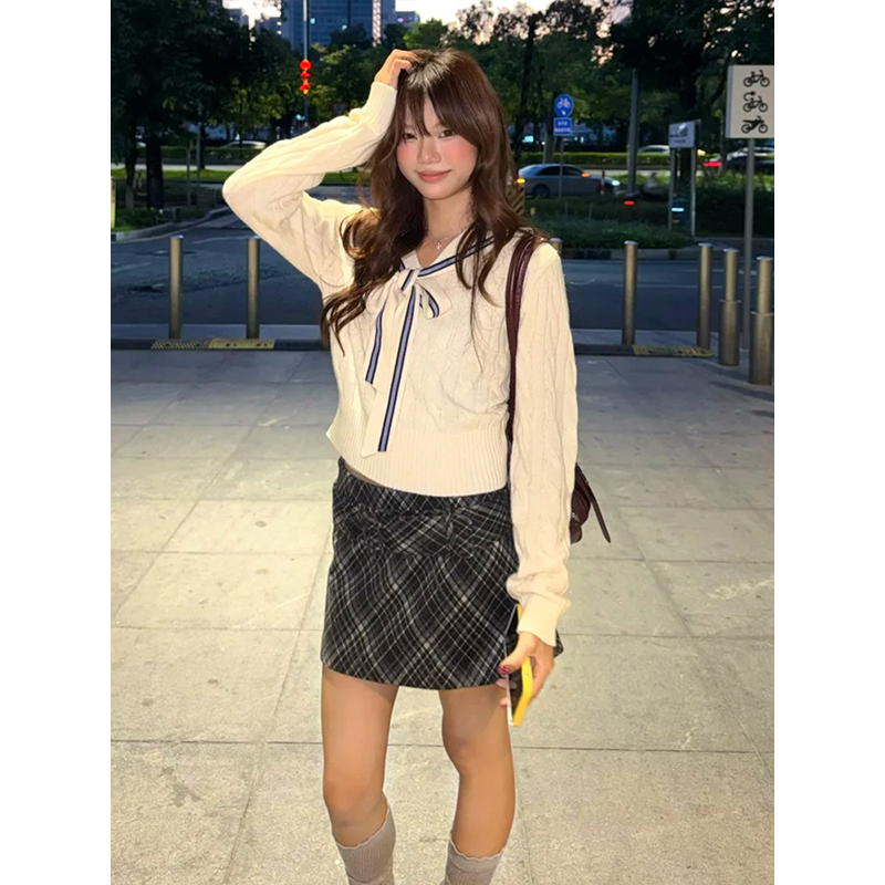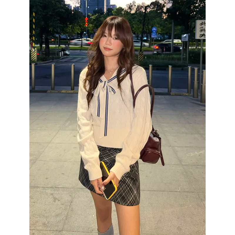 Preppy sailor-collar cable knit sweater with stripes. Soft, relaxed fit with a touch of Korean charm.