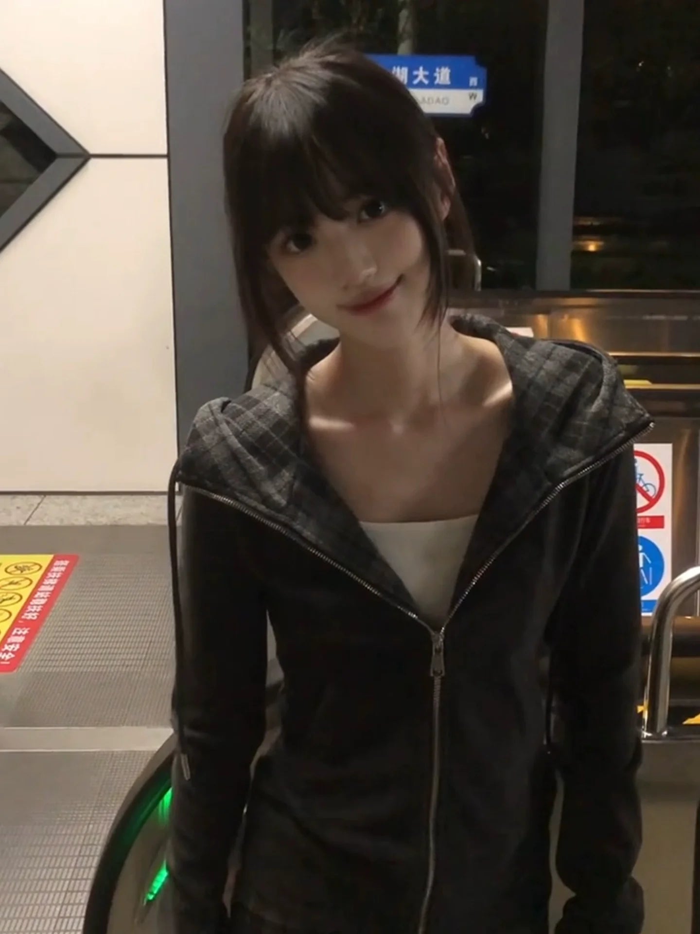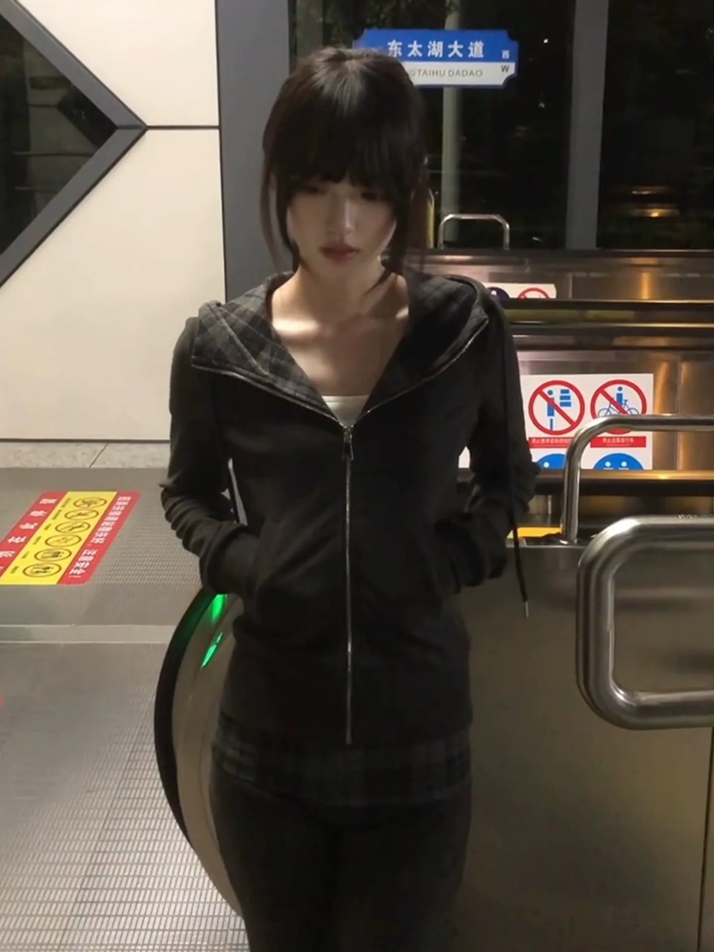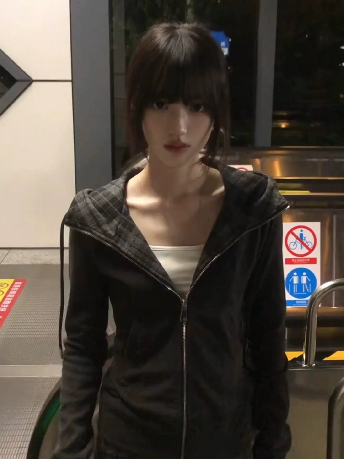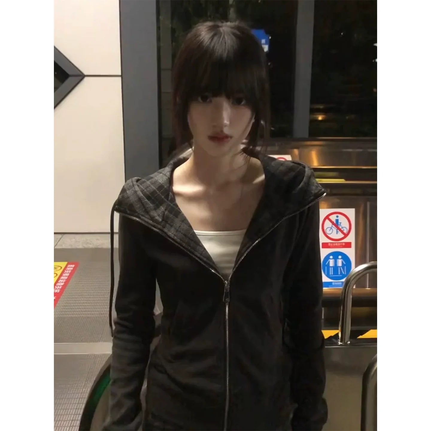 - Top: Autumn-winter slim fit hoodie with plaid patchwork, zip-up front, soft cotton blend, Y2K punk streetwear style.