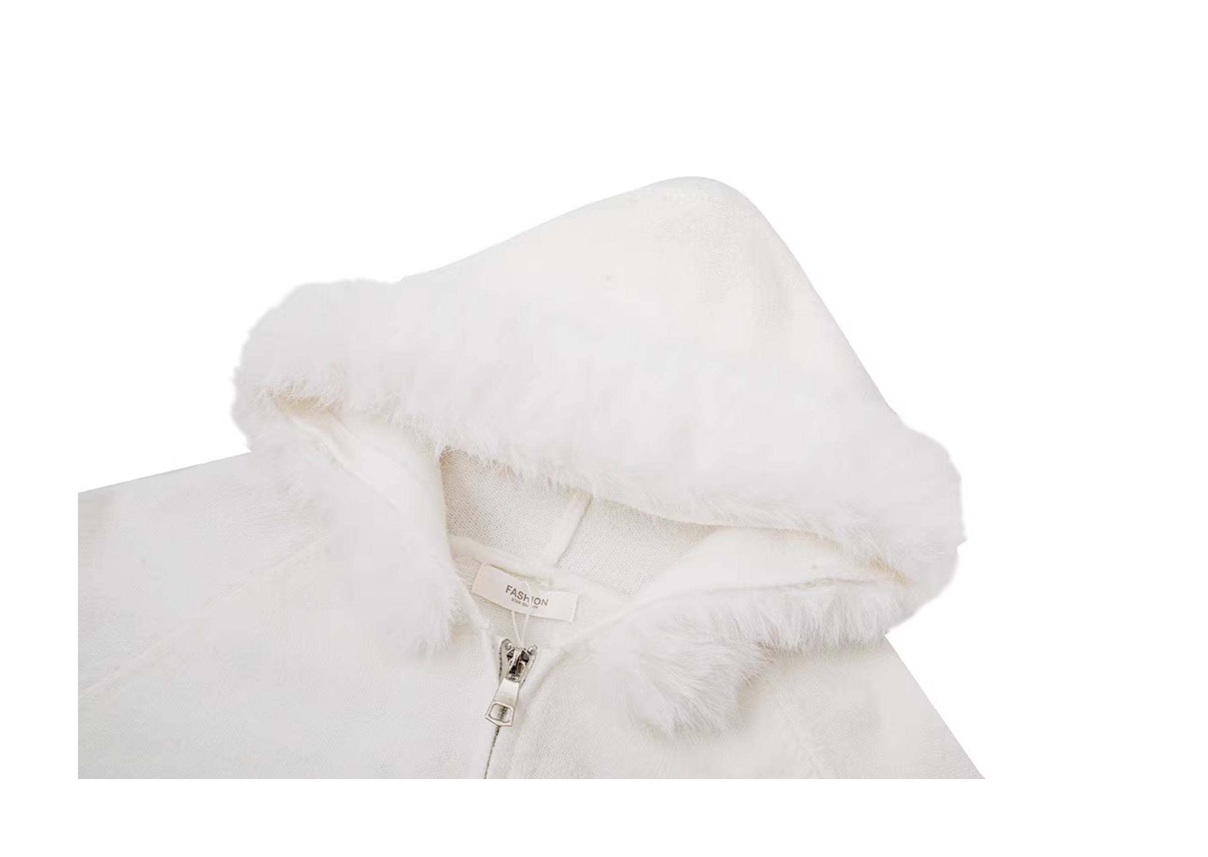 - Top: Soft knit hoodie with faux fur collar, relaxed fit, cozy autumn-winter knit fabric.