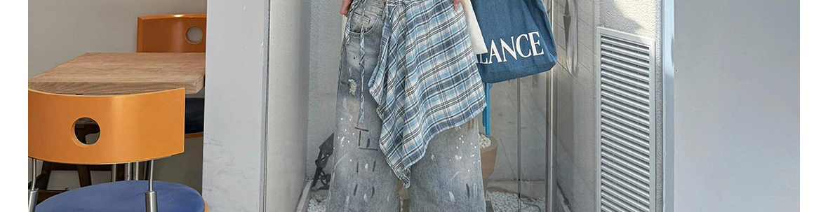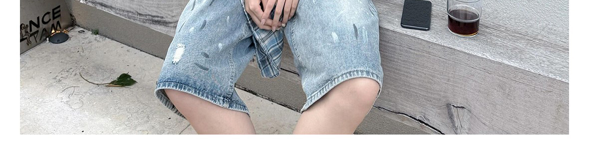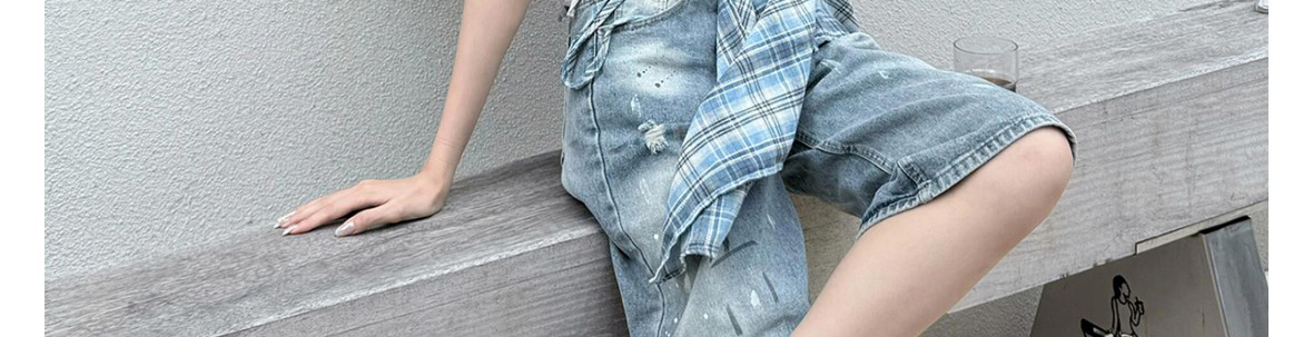 - Pants: Loose-fit mid-length denim pants with layered back flap design, straight-leg summer fabric.